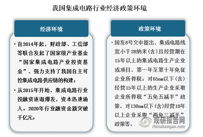 现如今,集成电路已经成为我国的战略性产业,国家对其发展高度重视,资本也涌入该赛道。因此近年来行业经济政策环境纷纷利好:经济环境来看,一方面自2014年起,财政部、工信部等联合发起了国家级产业基金“国家集成电路产业投资基金”,重点投资了国内芯片产业链龙头企业,强力支持了我国自主可控集成电路供应链的构建;另一方面,根据IT桔子数据库,从2015年开始,我国集成电路行业投融资逐渐爆发,资本迅速涌入。2020年行业融资金额突破千亿元;到2021年,我国集成电路行业共发生融资事件457起,融资金额高达1211.1亿元。政策环境来看,以国发8号文中为例,其中提到集成电路线宽小于28纳米(含)且经营期在15年以上的集成电路生产企业或项目,第一年至第十年免征企业所得税;对65nm以下(含)经营15年以上的生产企业采取企业所得税“五免五减半”的政策,对130nm以下(含)经营10年以上的企业采取“两免三减半”的政策等支持着行业的发展。