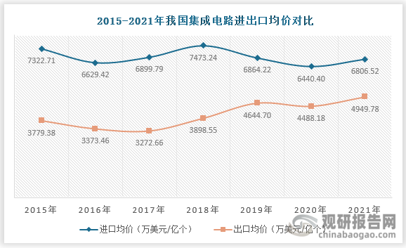 总的来说,近十几年来,我国集成电路行业取得较快发展,但是集成电路生产工艺流程复杂,需求设备及材料众多,且对技术要求极高。受限于技术壁垒、高端设备材料等,目前国内集成电路与发达国家和地区的集成电路相比,仍然存在着缺陷和不足,例如国内光刻机等高端设备和高端材料仅达14nm,与国际先进(3nm已可量产)仍有较大差距,因此我国集成电路行业高端市场产品仍然高度依赖进口。从2015年到2021年国内集成电路进口均价都维持在6600万美元/亿个;而其出口均价则最高也只是达到4949.78万美元/亿个,可见行业产品进口均价一直高于出口均价。但是值得注意的是,近三年来随着行业国产化进程的加速,技术水平的提升,国内集成电路进出口均价差额较过去有明显缩小态势,2021年其进出口均价差额约为1856.74万美元/亿个。