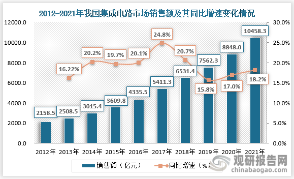 经济政策环境利好、技术取得进步、产量整体增长,叠加行业下游消费电子和汽车电子等领域对集成电路需求愈发旺盛,多重因素推动下,我国集成电路销售额持续增长,行业市场规模快速扩大。根据数据显示,2012年我国集成电路销售额约为2158.5亿元;到2021年其销售额便增长至了10458.3亿元。增速方面,从2013年到2021年其销售额同比增速均维持在15%以上,其在2017年其同比增速甚至高达24.8%。