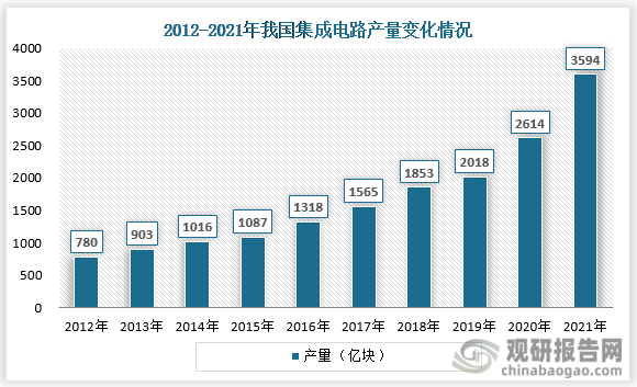 在行业经济政策背景纷纷利好背景下,再加上产学研界的共同努力,近10年来,国内集成电路技术经历了特征尺寸不断减小、新材料的导入、芯片设计向系统设计过渡等技术更迭的过程,行业技术也因此取得一系列的成绩。这使得国内集成电路产量整体表现为快速增长趋势。根据数据显示,2012年到2021年我国集成电路产量从779.6亿块增长3594.3亿块。