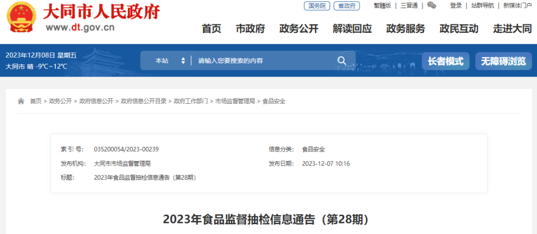 近期,大同市市场监督管理局组织食品安全监督抽检,共抽取餐饮食品、粮食加工品、调味品(食盐)、蔬菜制品、淀粉制品5大类食品的153批次样品。依据食品安全国家标准检验和判定:153批次样品中合格样品146批次、不合格样品7批次,不合格样品具体情况如下:一、灵丘县众喜豆业营销部经销的标称灵丘峰瑞磨坊生产、标注生产日期为2023年10月3日的苦荞面粉,铅(以Pb计)项目不符合食品安全国家标准。检测机构为大同市综合检验检测中心。二、大同市平城区李存兰食品经销部经销的购进日期为2023年11月7日的宽粉条,山梨酸及其钾盐(以山梨酸计)项目和铝的残留量(干样品,以Al计)项目,不符合食品安全国家标准。检测机构为大同市综合检验检测中心。 三、大同市平城区李存兰食品经销部经销的购进日期为2023年11月7日细粉条,铝的残留量(干样品,以Al计)项目不符合食品安全国家标准。检测机构为大同市综合检验检测中心。四、大同市南郊区聂大女面皮经销部经销的标称大同市新荣区元尚食品加工厂生产、标注生产日期为2023年11月3日的东北(风味)大拉皮,铝的残留量(干样品,以Al计)项目不符合食品安全国家标准。检测机构为大同市综合检验检测中心。五、大同市平城区聚盛烤肉店在用的加工日期为2023年10月11日的小碗,阴离子合成洗涤剂(以十二烷基苯磺酸钠计)项目不符合食品安全国家标准。检测机构为太原海关技术中心。六、大同市平城区汉斯啤酒自助烤肉华林店在用的加工日期为2023年10月11日的杯子,阴离子合成洗涤剂(以十二烷基苯磺酸钠计)项目不符合食品安全国家标准。检测机构为太原海关技术中心。 阴离子合成洗涤剂(以十二烷基苯磺酸钠计)项目不符合食品安全国家标准。检测机构为太原海关技术中心。针对上述抽检中发现的不合格产品,我局已督导产品经销、加工所在地县级市场监管部门按照相关法律法规依法处理。消费者如果在市场上发现被通报的不合格产品,可拨打12315投诉举报。产品相关信息见附件。