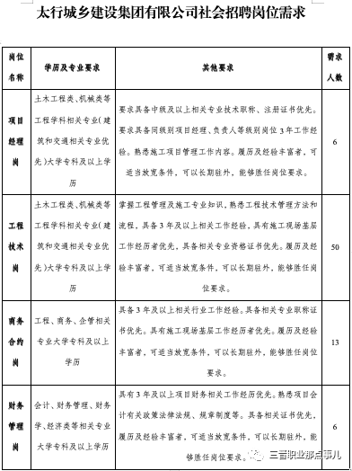 太行城乡建设集团有限公司于2022年12月29日正式挂牌成立,是河北交通投资集团为落实“一体两翼、六驱、五化”发展战略布局,通过统筹整合交投集团所属相关企业,汇聚基础建设力量所重组设立的全资二级子集团。作为交投集团推进“三大三新”产业发展中“大基建”业务板块落地的主力军和先锋队,太行城乡建设集团主要业务涵盖交通基础设施建设、新型城镇化建设、国土空间生态修复和乡村振兴基础设施建设四大产业方向。目前持有公路工程、市政公用工程、建筑工程施工总承包壹级等共计24项建设施工类相关资质,基本实现工程施工全牌照和城乡建设全链条;依托拥有AAA级信用评级的交投集团省级平台与十余家各类银行金融机构建立高水平融资渠道,有较强的项目投资优势;通过“土地+”“资源+”“股权+”等模式创新实现包含“融资、投资、建设、运营”横跨土地整理、城乡开发、交通建设的一体化经营,具备产业协同优势。“十四五”期间,太行城乡建设集团将以打造最具影响力的现代城乡建设领军企业为愿景,服务服从全省经济社会发展大局,推进“一主两化四核四强”发展战略全面落地,预计到“十四五”末,太行城乡建设集团资产总额达120亿元,年营业收入突破100亿元,努力成为全国城镇建设最知名企业、全国乡村振兴先锋企业、中国城市更新一流企业。为满足城乡建设公司各所属企业发展需要,提升管理水平和企业效益,保证生产经营工作顺利进行,现就城乡建设公司社会招聘有关事项公告如下: