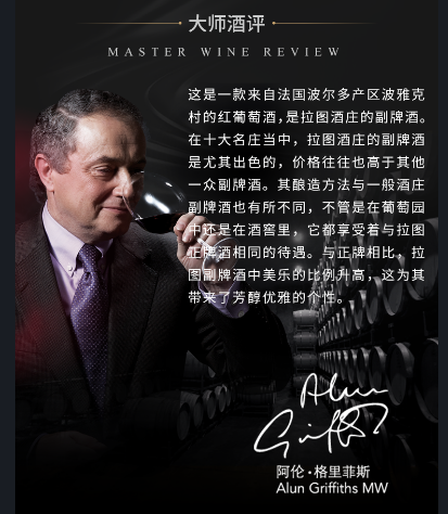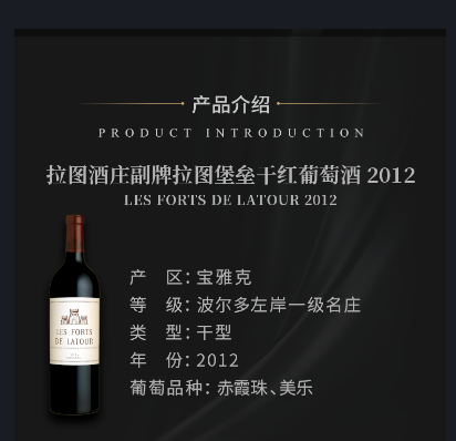 这是款来自法国波尔多产区波雅克村的红葡萄酒 ,是拉图酒庄的副牌酒。在十大名庄当中,拉图酒庄的副牌酒是尤其出色的,价格往往也高于其他一众副牌酒。其酿造方法与一般酒庄副牌酒也有所不同,不管是在葡萄园中还是在酒窖里,它都享受着与拉图正牌酒相同的待遇。与正牌相比:拉图副牌酒中美乐的比例升高,这为其带来了芳醇优雅的个性。