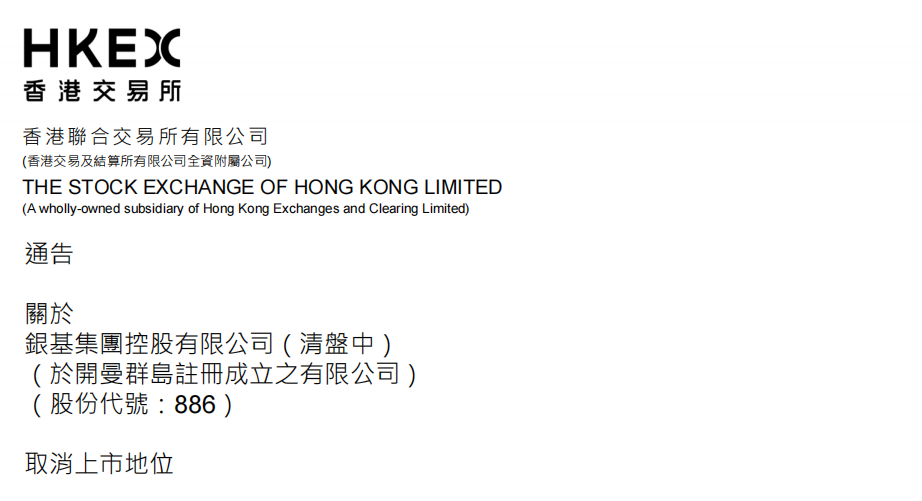 12月4日,香港联交所发布公告称,银基集团被取消上市地位。这也意味着,曾号称中国“酒类流通第一股”的银基集团走下了历史舞台。