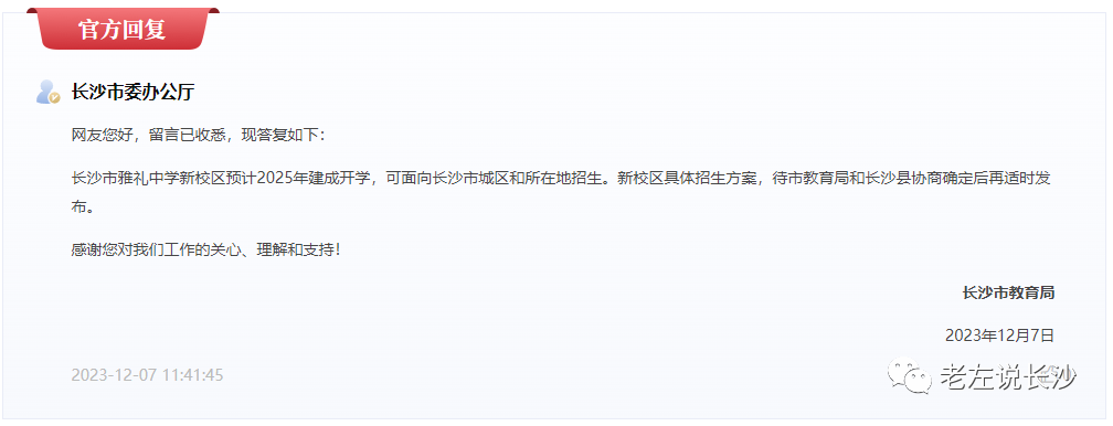 雅礼中学新校区由长沙城发集团负责建设,建成后整体移交雅礼中学,新校区预计2025年建成开学。