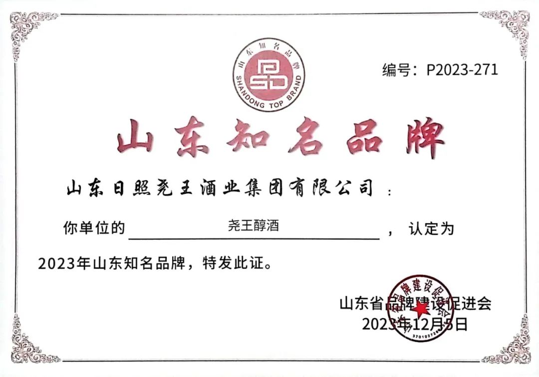 品势向新,数智赋能。12月5日,由山东省品牌建设促进会主办的2023年山东品牌年会在济南圆满举办。本次年会重磅发布了2023年山东知名品牌认定名单。我公司“尧王醇酒”被认定为“2023年山东省知名品牌”。