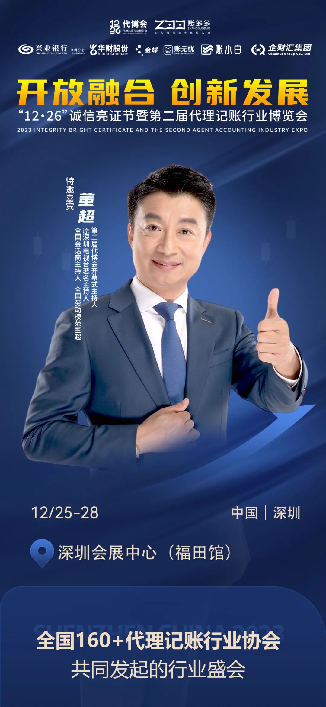 “开放融合,创新发展”12.26诚信亮证节暨第二届代博会将盛大开幕,本届盛会开幕式我们邀请全国劳动模范,全国金话筒主持人董超先生担纲主持。盛会由160+代理记账行业协会联合发起,10000+代账机构精英齐聚深圳,是代理记账人自己的节日,与您相约12月26日福田会展中心3、4号馆,不见不散!
