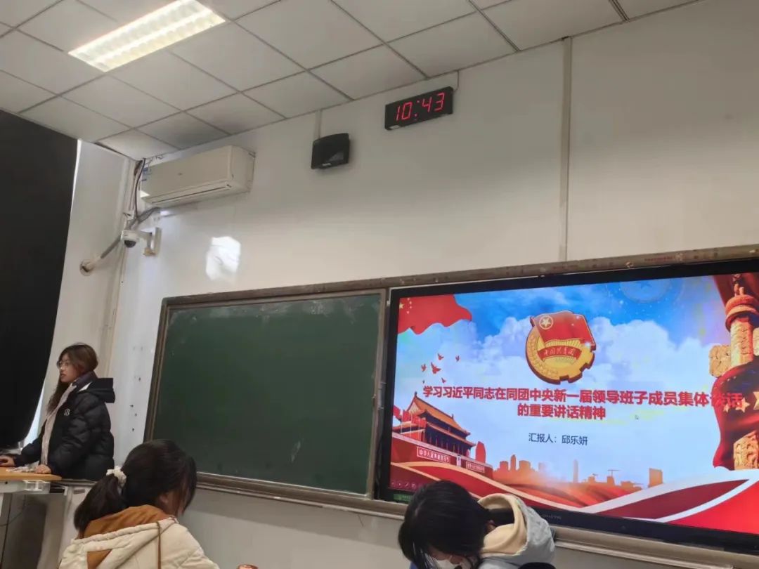 邱乐妍同学针对习近平同志在同团中央新一届领导班子成员集体谈话的重要精神进行了讲述,我们身为 共青团员应该深入贯彻党中央要求,切实肩负起新时代新征程党赋予的使命任务,传承弘扬优良传统,坚持改革创新,更好把青年一代团结凝聚在党的周围,为推进强国建设、民族复兴伟业接续奋斗。