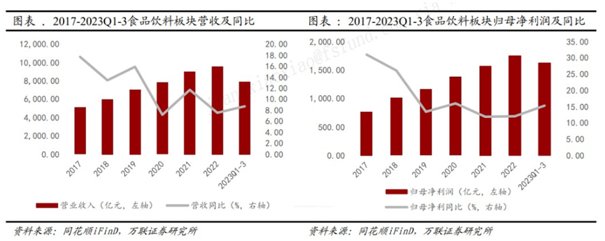 白酒目前的确是处于一个比较尴尬的境地,虽然说从基本面上看,吃喝板块韧性较强。2023年前三季度食品饮料板块业绩维持稳健增长,营业收入合计7885.41亿元,同比增长8.71%,在31个申万一级行业中排名第4。归母净利润合计1621.71亿元,同比增长15.28%,排名第7。近年来,即使处于公共卫生防控期间,食饮板块营收/归母净利润仍旧维持正增长,板块业绩稳定性强。