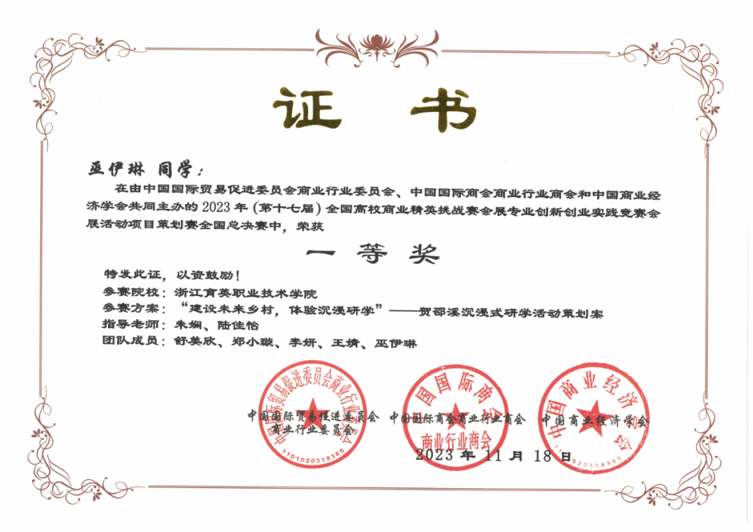 11月18日,我校20会展班的娄灵婧、巫伊琳两位同学双双获得2023年(第十七届)全国高校商业精英挑战赛会展专业创新创业实践竞赛会展活动项目策划赛全国总决赛一等奖,并获得国际(新加坡)入围奖;12月8日,巫伊琳同学还获得2023浙江省第十三届会展策划创意大赛一等奖 。