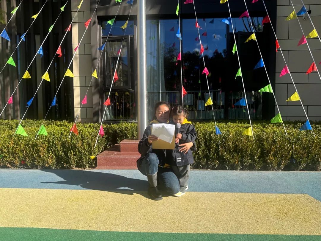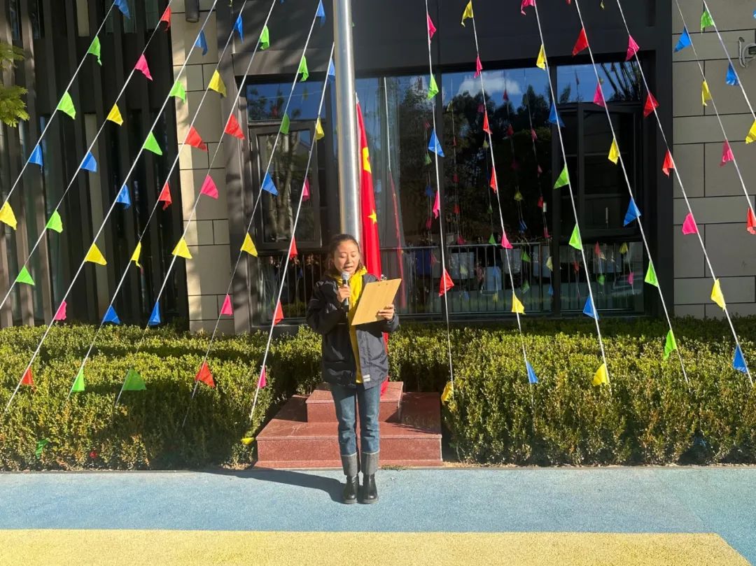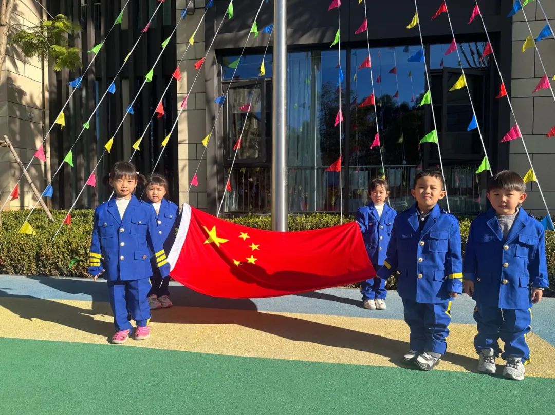 国歌奏响,全体老师和小朋友们注视着冉冉升起的五星红旗,齐声歌唱。