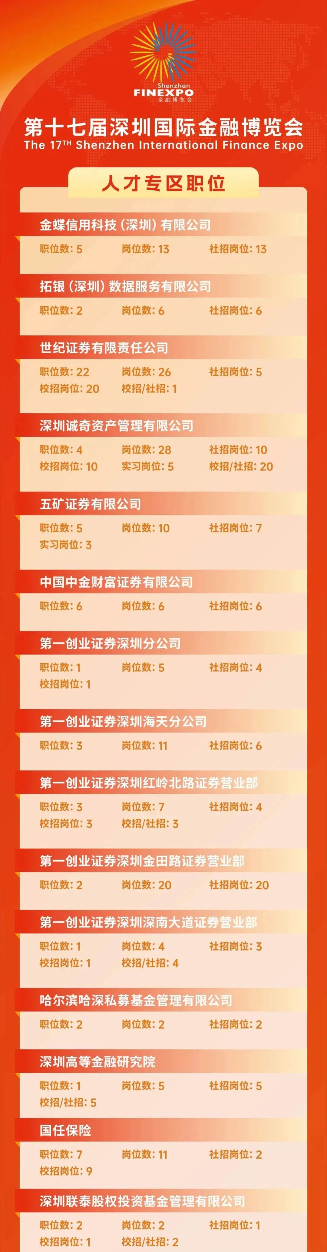 本次金融人才专区括证券公司、期货公司、保险机构在内的100多家金融机构,面向全球招募金融人才,在展会期间提供超过2500个优质岗位,涵盖金融科技、运营、销售、管理等领域。QFII销售、管培生、合规管理、衍生品交易、经纪人、BIM项目经理、FOF投资经理、算法工程师、精算师等!无论你是学生、从业人员还是金融大咖,这里都有你的舞台。