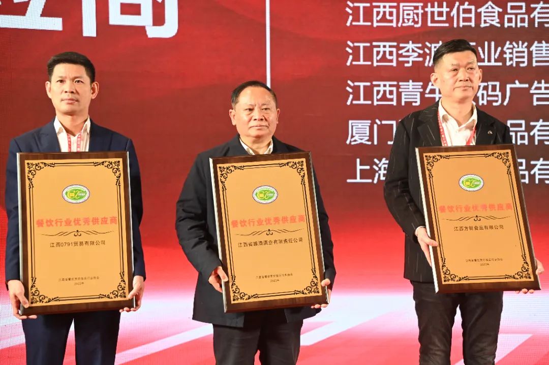 江西省赣酒酒业有限责任公司获得“餐饮行业优秀供应商”奖,江西省赣酒酒业有限责任公司董事长张辉军获得此次大会的“突出贡献奖”。