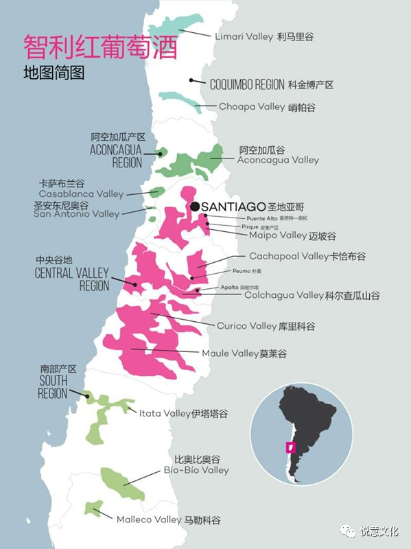 位于南半球的智利,这个国土形状十分狭长的南美国家,也是世界上非常重要的葡萄酒生产国之一。自北向南主要分为科金博产区、阿空加瓜产区、中央山谷产区和南部产区等四个葡萄酒产区。
