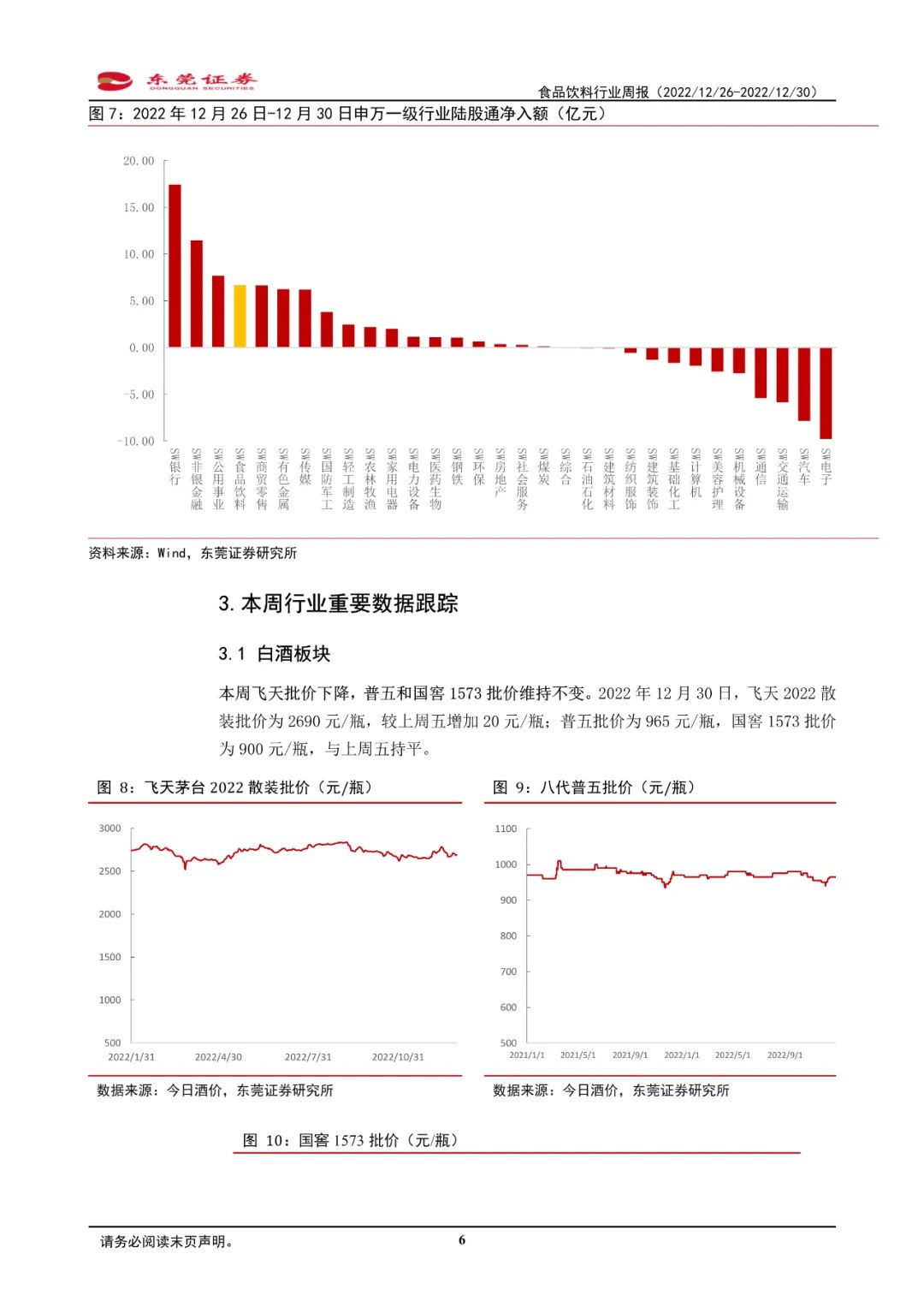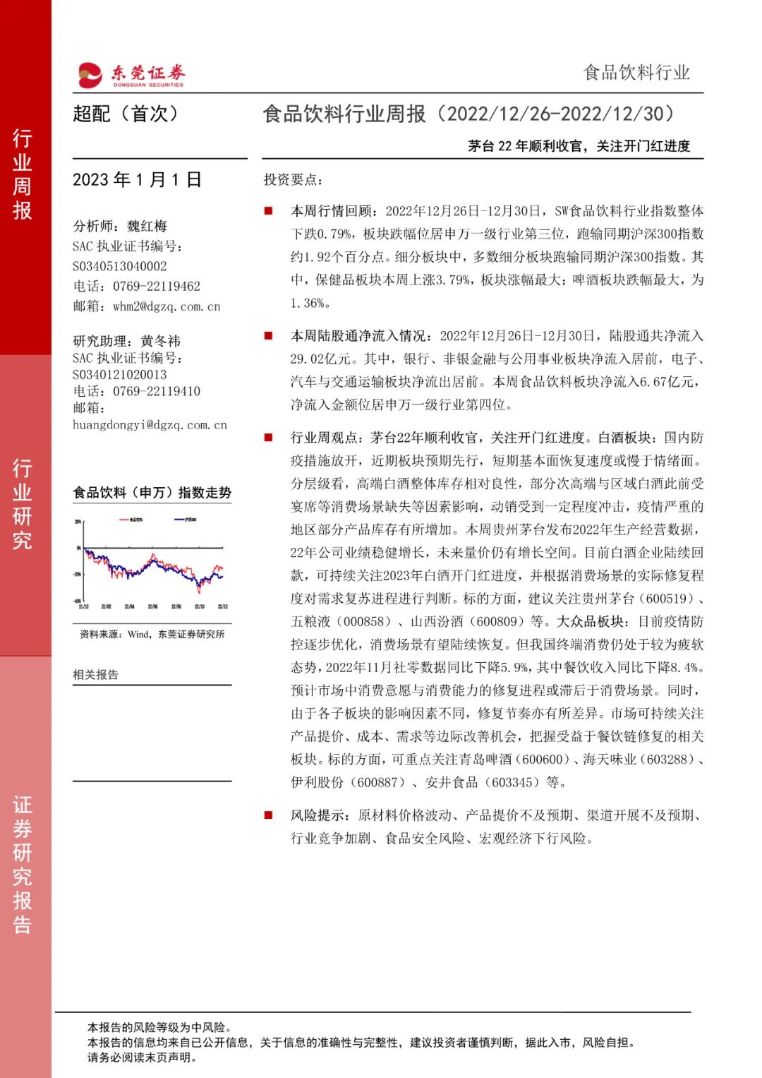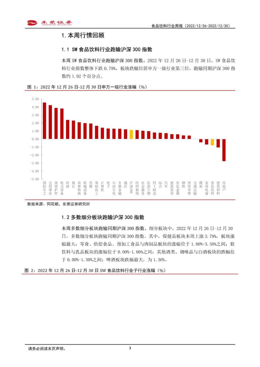 2022年12月26日-12月30日,SW食品饮料行业指数整体下跌0.79%,板块跌幅位居申万一级行业第三位,跑输同期沪深300指数约1.92个百分点。细分板块中,多数细分板块跑输同期沪深300指数。其中,保健品板块本周上涨3.79%,板块涨幅最大;啤酒板块跌幅最大,为1.36%。
