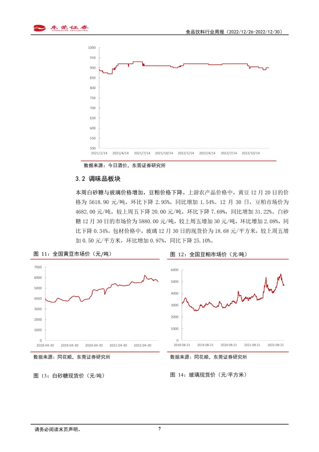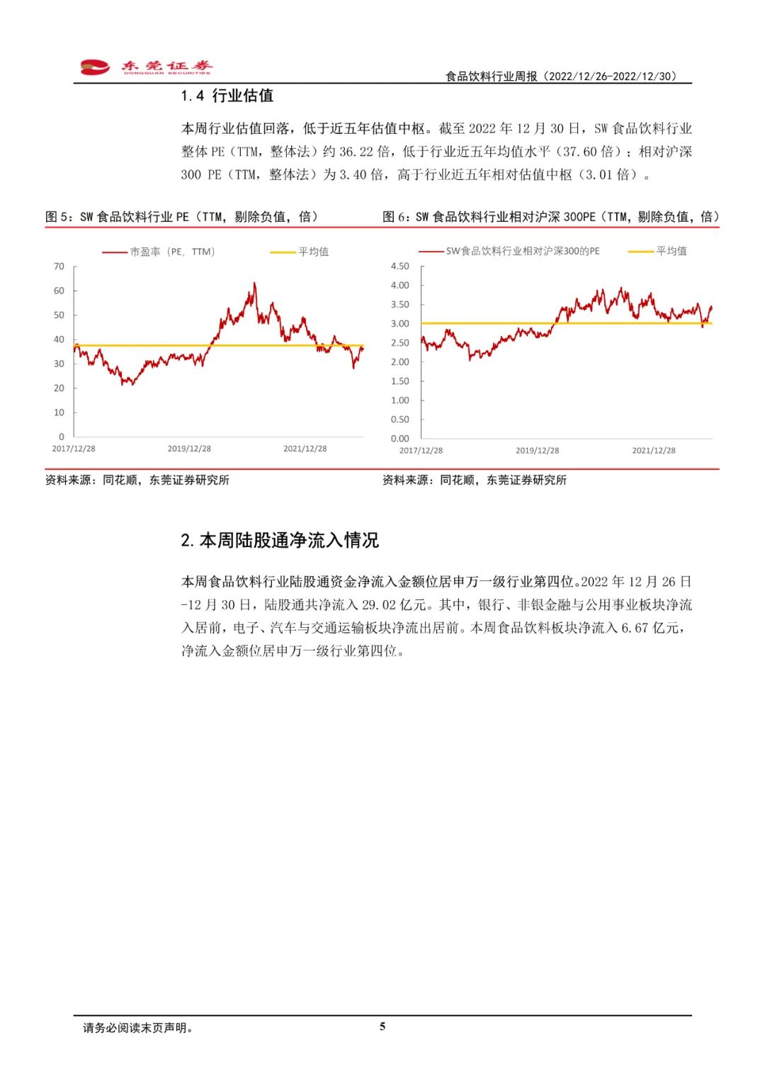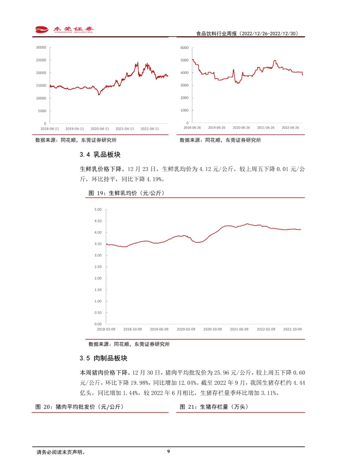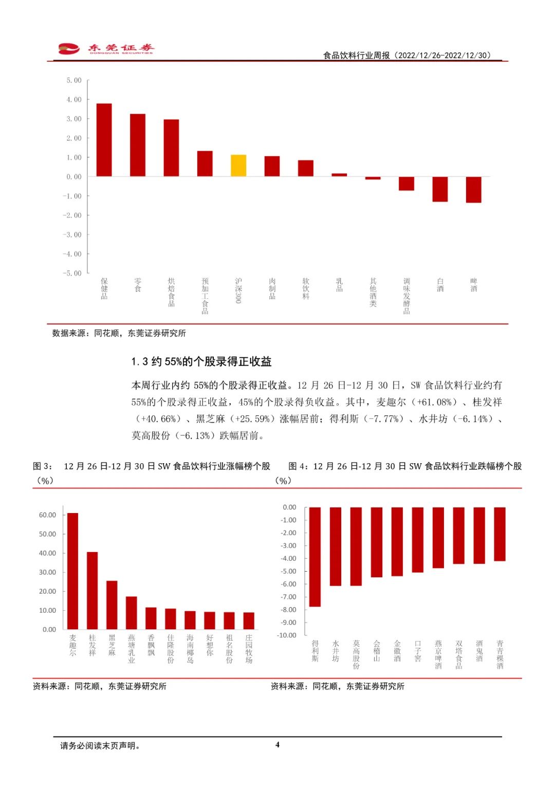 2022年12月26日-12月30日,SW食品饮料行业指数整体下跌0.79%,板块跌幅位居申万一级行业第三位,跑输同期沪深300指数约1.92个百分点。细分板块中,多数细分板块跑输同期沪深300指数。其中,保健品板块本周上涨3.79%,板块涨幅最大;啤酒板块跌幅最大,为1.36%。