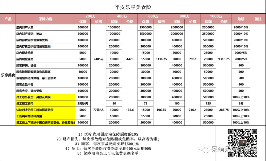 1 医疗费用:员工医疗费用免赔100元,社保内90%报销。顾客医疗费用免赔500元,社保内用药100%报销。