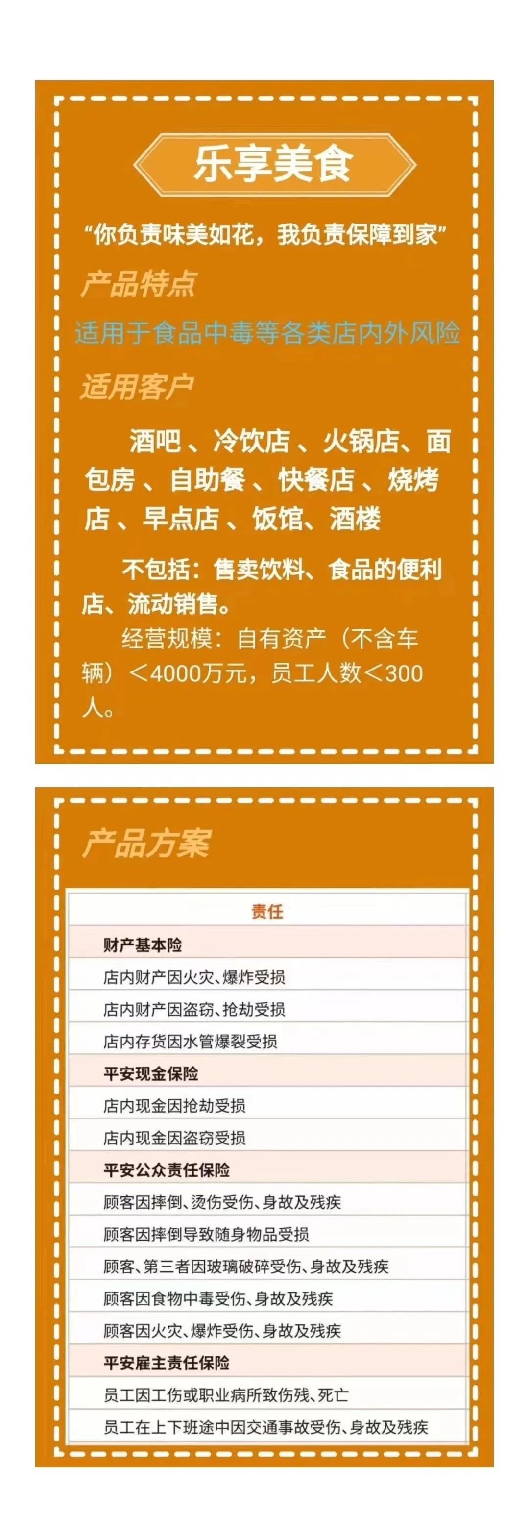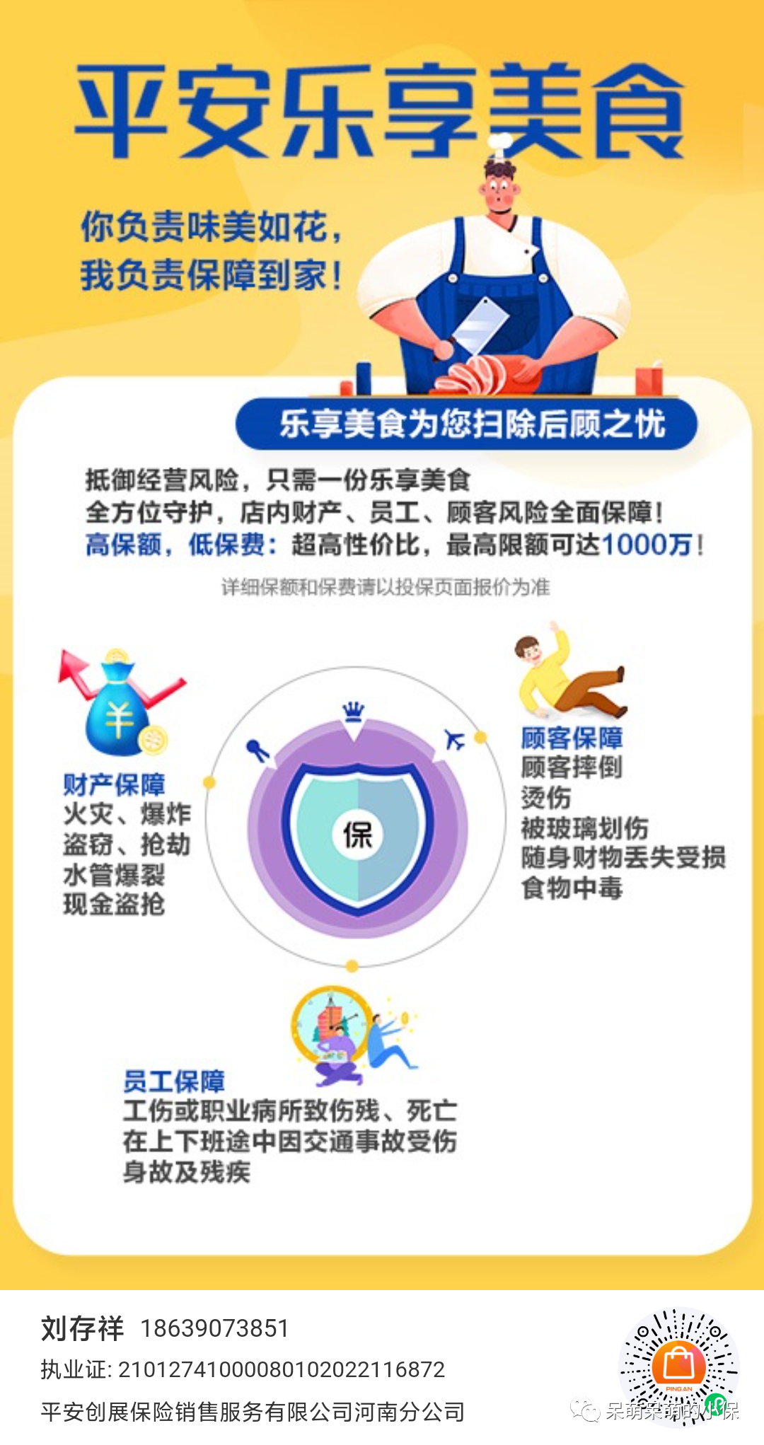 开门做生意,每位老板都希望生意能红红火火,但是不当老板不知道,只有自己知道自己有多么辛苦。除了应对能预想到的各种事情,还时时刻刻担心可能出现的突发情况。好消息来了。平安乐享美食为您的事业保驾护航,您只管奋斗,我来兜底!