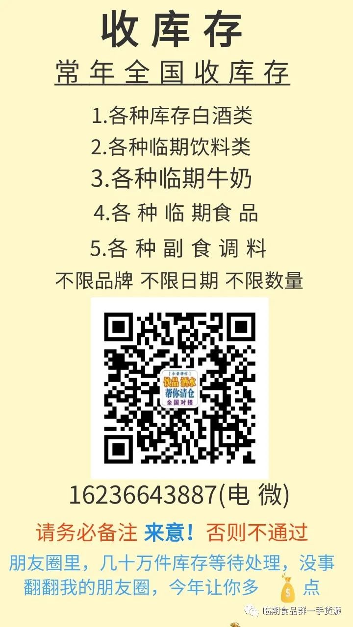 如果你是做代理的 ,搞批发部的, 商店, 超市, 奶站, 折扣店,电商, 等搞活动的,做促销的。如需要特价货的 ,看看他们的朋友圈里 每天都有几十万件( 白酒 啤酒 牛奶 饮料 等) 特价产品等待处理. 每天都在更新 价格优势特别大!加微注意:这里都是批量发货,不零售 不散拼 行业小白请勿扰!