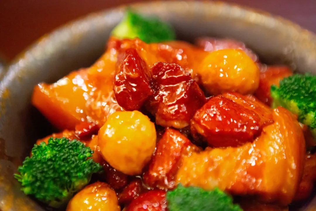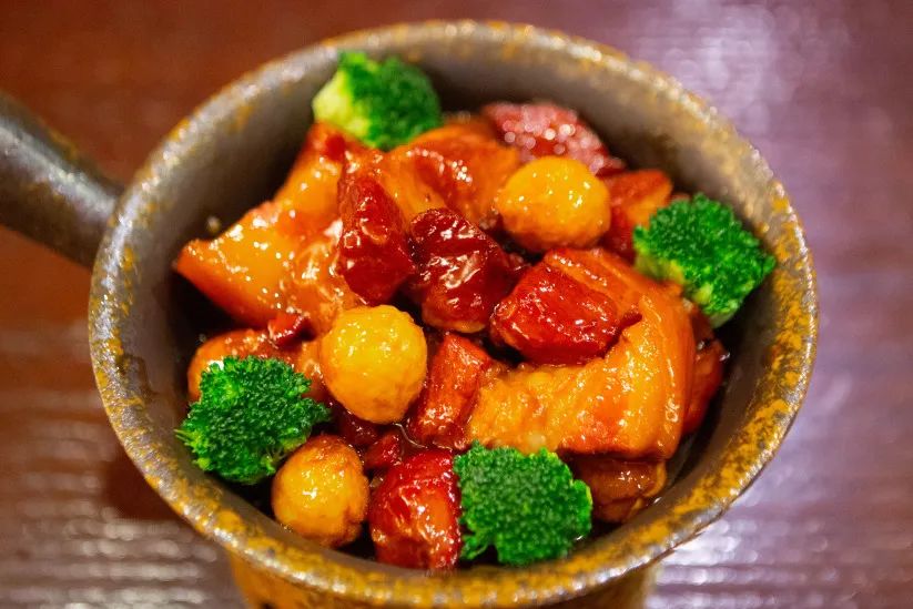 上桌时棕褐色的红烧肉泛着油亮