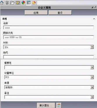零件及装配体模型建立完成后,必须填写“自定义属性卡”,内容包括:名称,图样代号、物号、材料、备注。