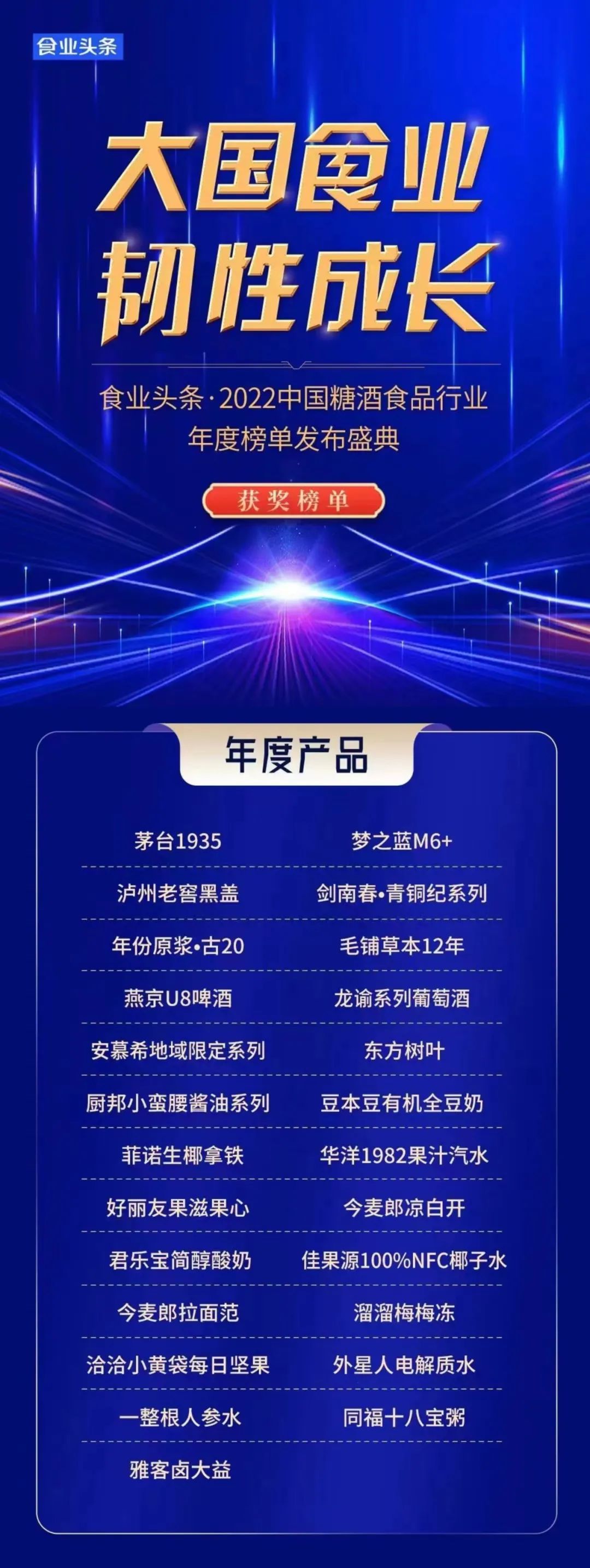 2022中国糖酒食品行业年度榜单旨在评选出2022年中国糖酒食品行业(包含农副产品加工,食品制造,酒、饮料和精制茶制造等大类)最具影响力的企业家、品牌、产品和渠道,总结2022年的发展历程和亮点,彰显2022年企业和产品发展成就,引导向领先者看齐的行业氛围。