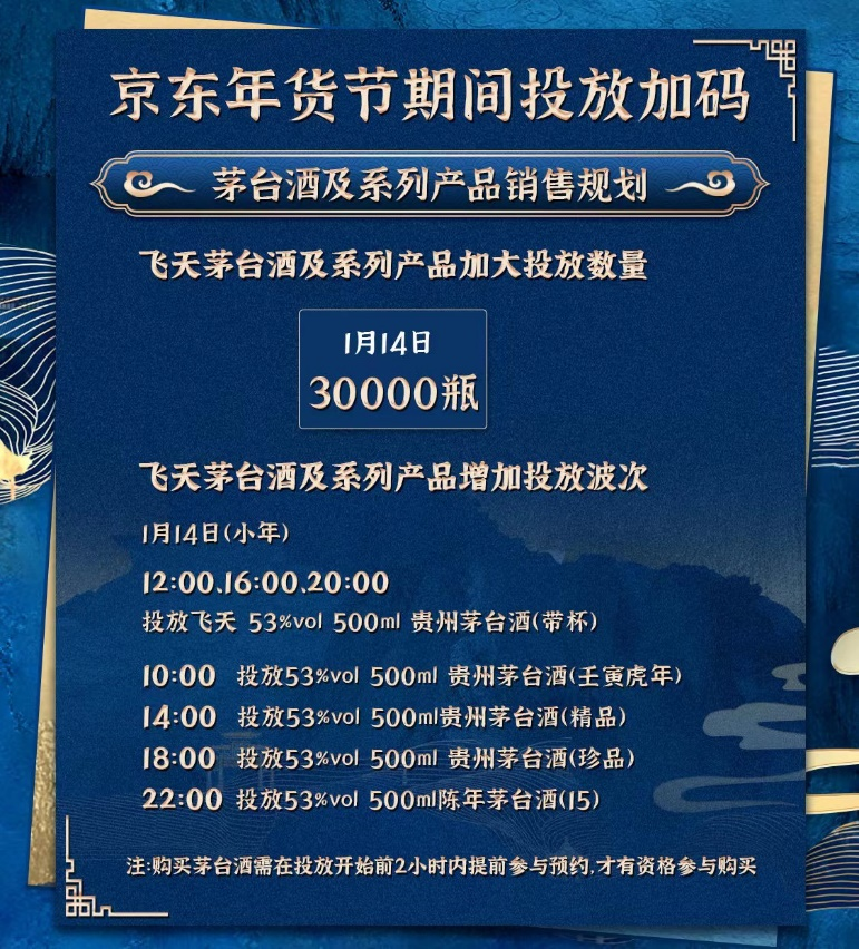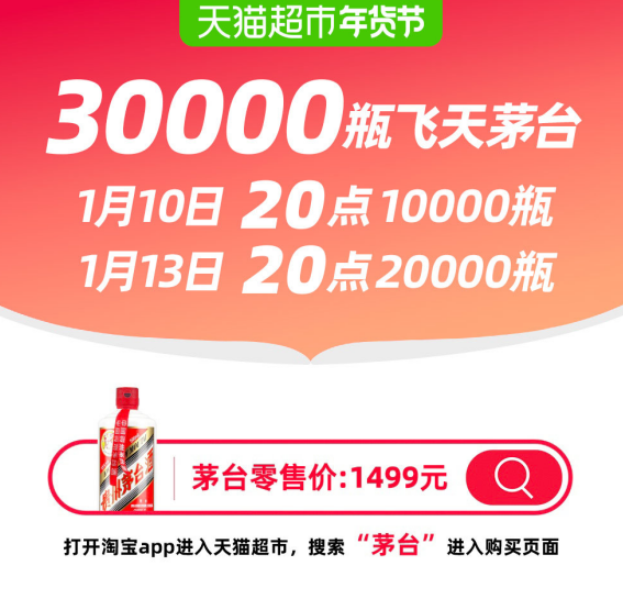 可通过淘宝app进入天猫超市,搜索“茅台”进入购买页面,也可以在天猫超市点击“直播间”准时抢购,每人限购2瓶。