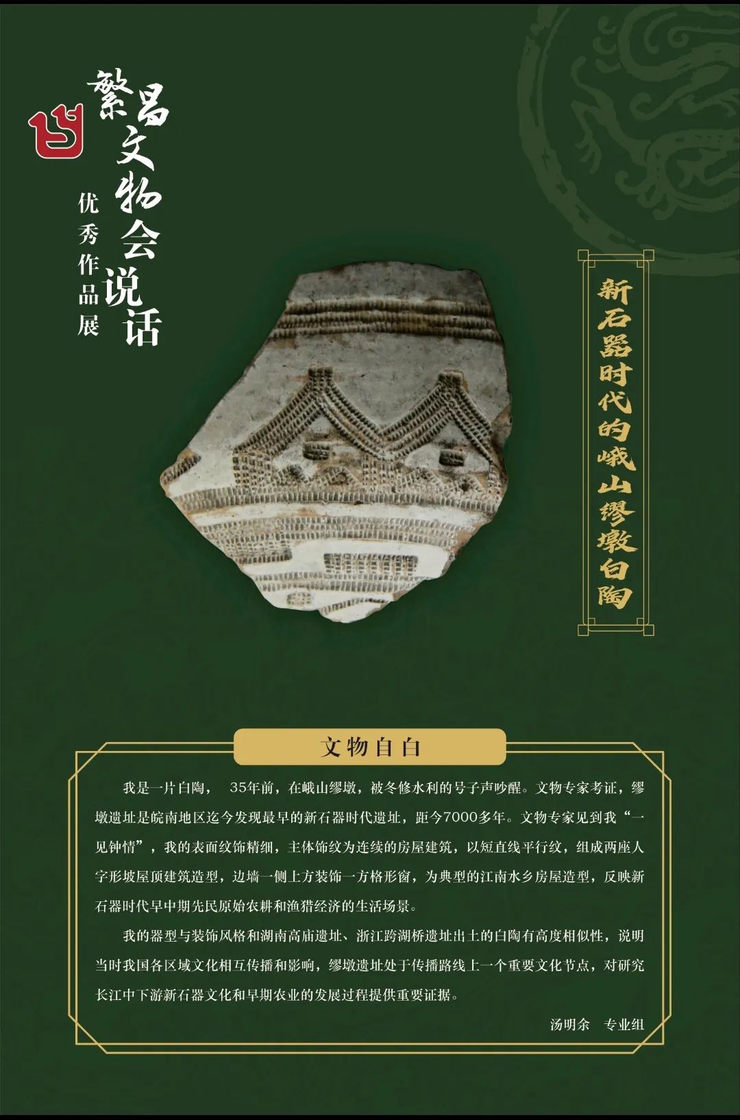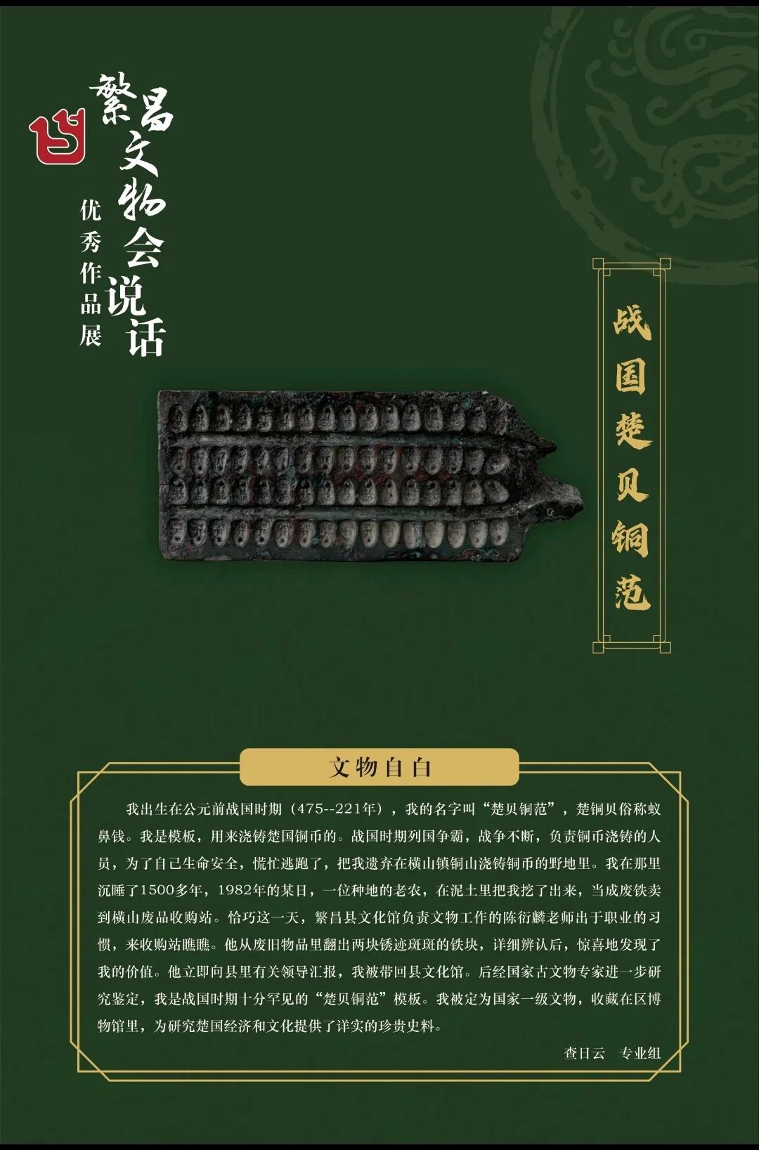 岁月失语,惟石能言。中华五千年悠久的文明传承,不仅仅是史书中泛黄的记忆,博物馆里沉寂不动的展品,这些不可再生、不可替代的宝贵资源,正为亿万中华儿女注入强大的精神动力。为展示繁昌独特的精神标识,更好构筑繁昌精神、繁昌价值、繁昌力量,6月8日-9月3日,由区教育局、区文旅体局、共青团繁昌区委员会主办,区文保中心(博物馆)承办,区作家协会协办的“繁昌文物会说话”300字短文征集大赛在繁昌区博物馆成功举办。