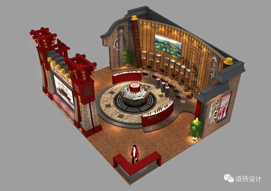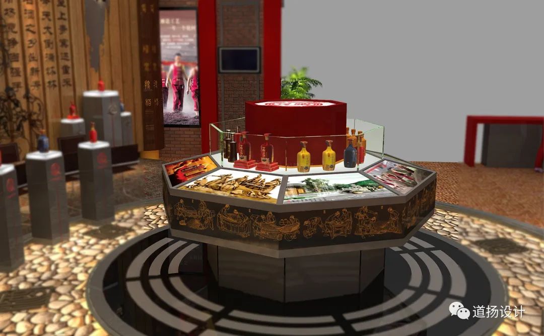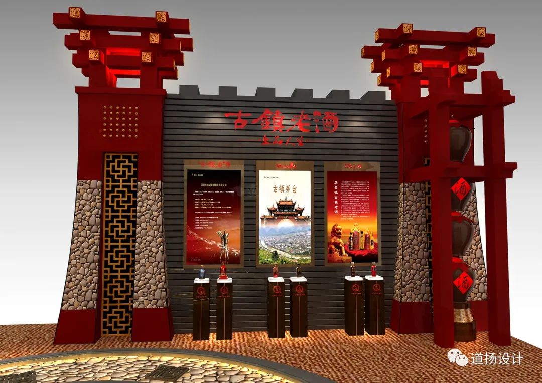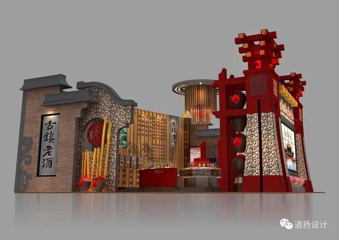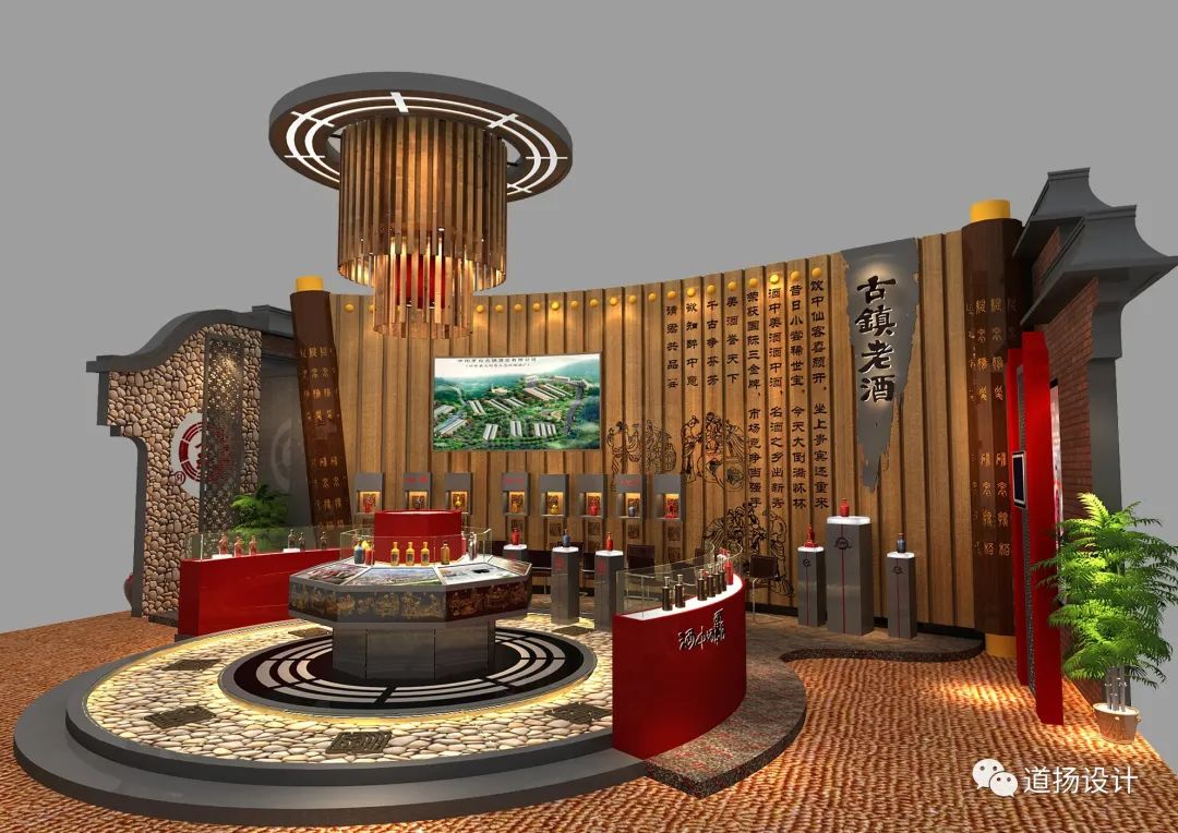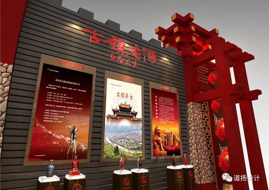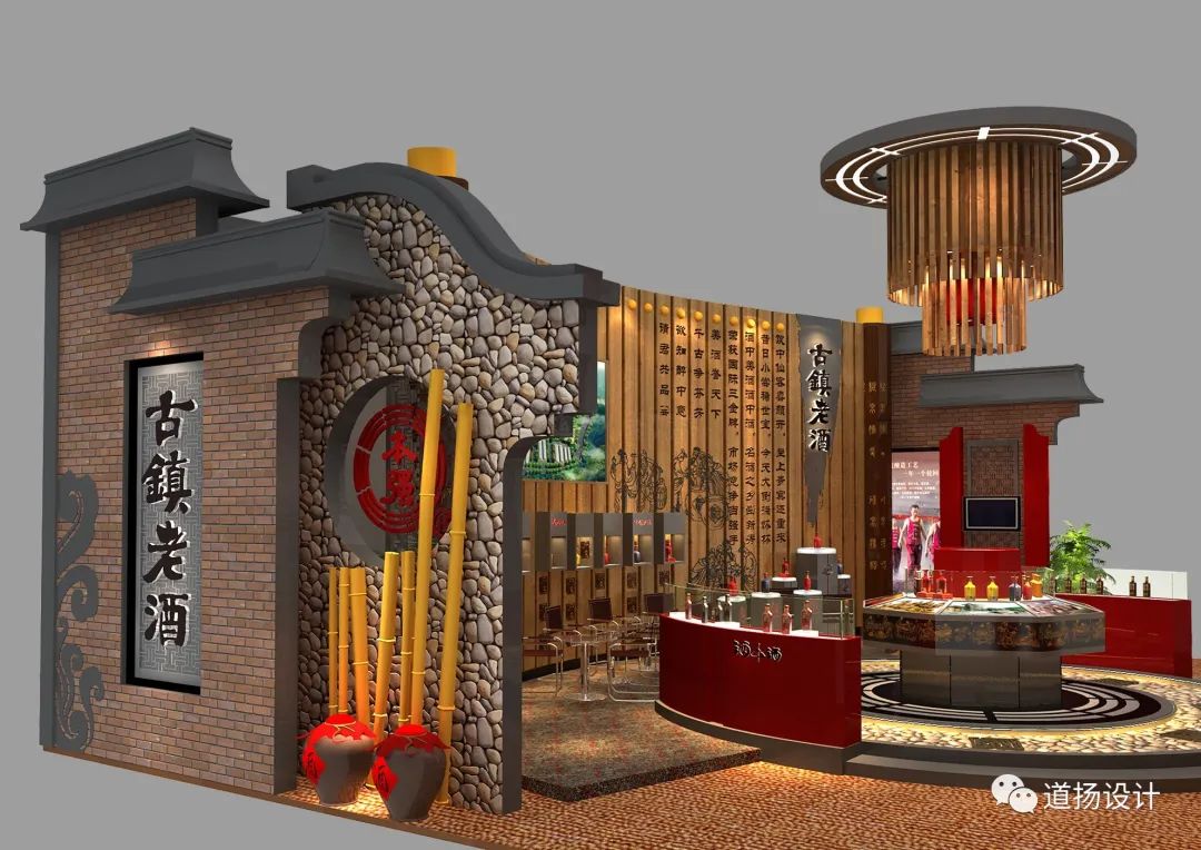 酿造文化与传统书墨形式相结合,于无声间展现老酒的内在魅力。同时在布展中,道扬的设计团队在整体造型上采用了古典建筑力学。创造性“天圆地方”的布局规律打造符合中国古典审美的展位。外部展墙以“方形”塑型,中心以“圆形”作为展示展品的展柜,美观度与实用性两不相误。