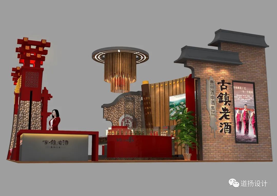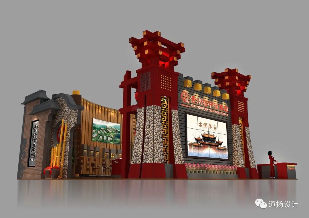 贵州茅台镇酒中酒糖酒会展位设计结合中国传统文化特色,突出呈现贵州当地文化风俗,重点展示酒中酒悠久的酿酒文化历史。通过井傒式门厅装饰设计,使参观者仿佛进门就开启了时光之门,领略到贵州古镇深厚的历史风光。装饰以大量当地采集的鹅卵石,仿佛能听到赤水河潺潺流水声,流进一个个酒厂的酿酒作坊。本项目的设计考虑了展品展示效果、企业形象定位、观众参展体验等诸多因素,真正从实际问题出发,让企业放心,让观众开心。