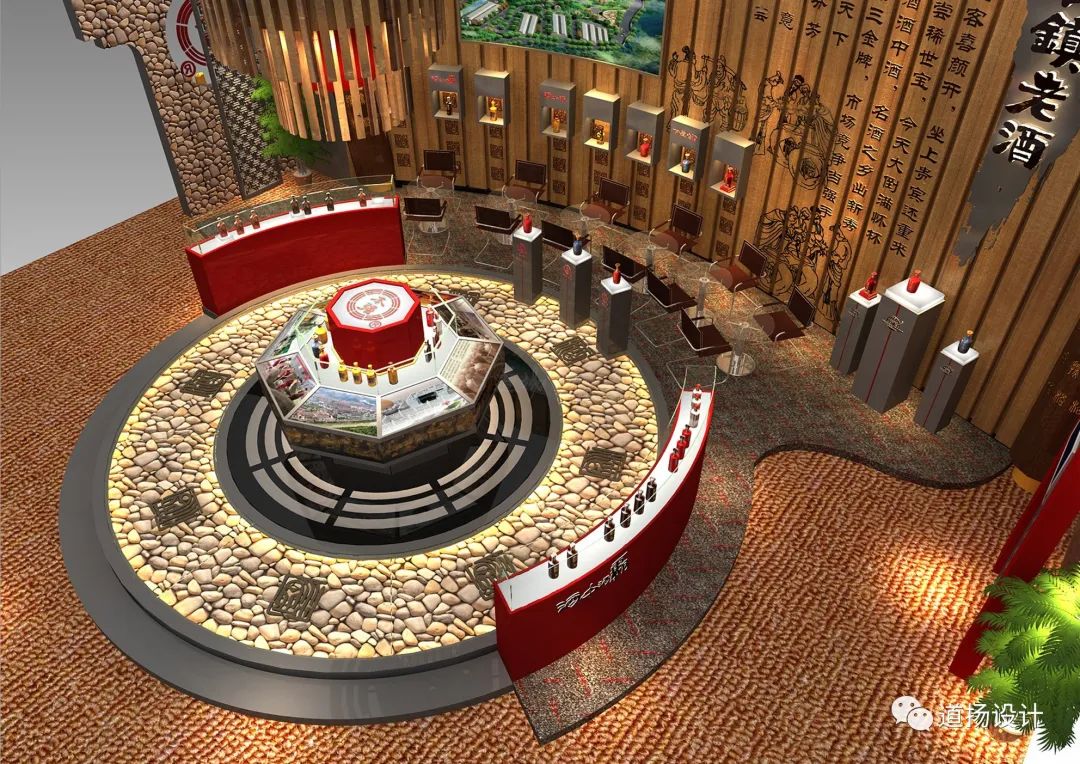 酒中酒集团是坐落在赤水河边的企业,对赤水有着别样的感情,考虑到这一点,道扬设计做出了把赤水河的元素融入布展设计中。最开始直接以“水”作为元素,但后来推敲发现水能代表的地点太多,赤水河并不算其中最知名的河道。最终,道扬的设计团队集思广益,最终敲定了以“鹅卵石”作为“赤水元素”融入设计当中。