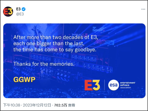 12月12日,E3电玩展主办方ESA,通过其官方网站及社群平台发布终止举办例行展会的消息。至此,长达20多年的E3电玩展被正式划上句号。E3电玩展与德国科隆游戏展、日本东京电玩展并称为世界三大游戏展。每年5-7月间的3、4天里,E3电玩展在美国洛杉矶会展中心举办(1995年至2006年、2008年至2019年;2007年缩小规模在别处举办)。此前受新冠疫情影响,原定在2020年举办的线下展会被取消,之后2021年改为线上形式举办。2022年原本计划恢复线下展会,但因为一些发行商选择自行举办活动而取消。这使得2019年E3电玩展成为该展会最后一届线下展会。在公告结尾,官方使用了电竞圈术语“GGWP”(玩得不错)向公众告别。