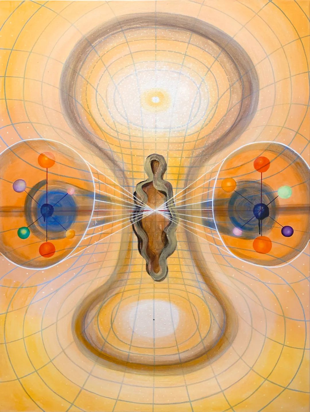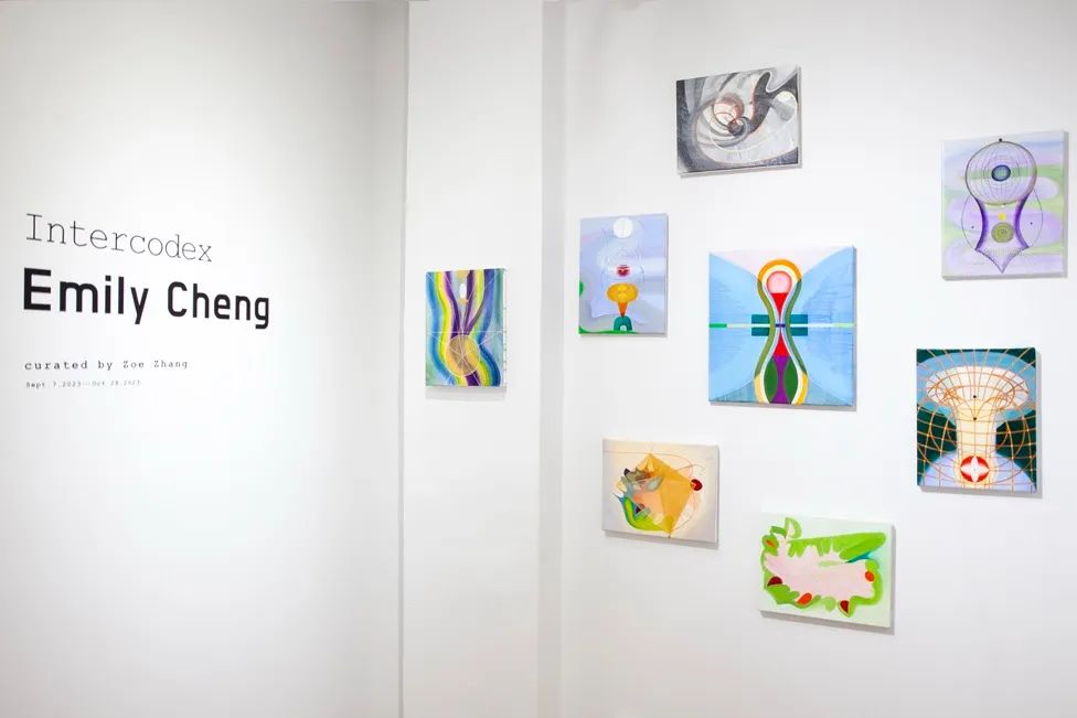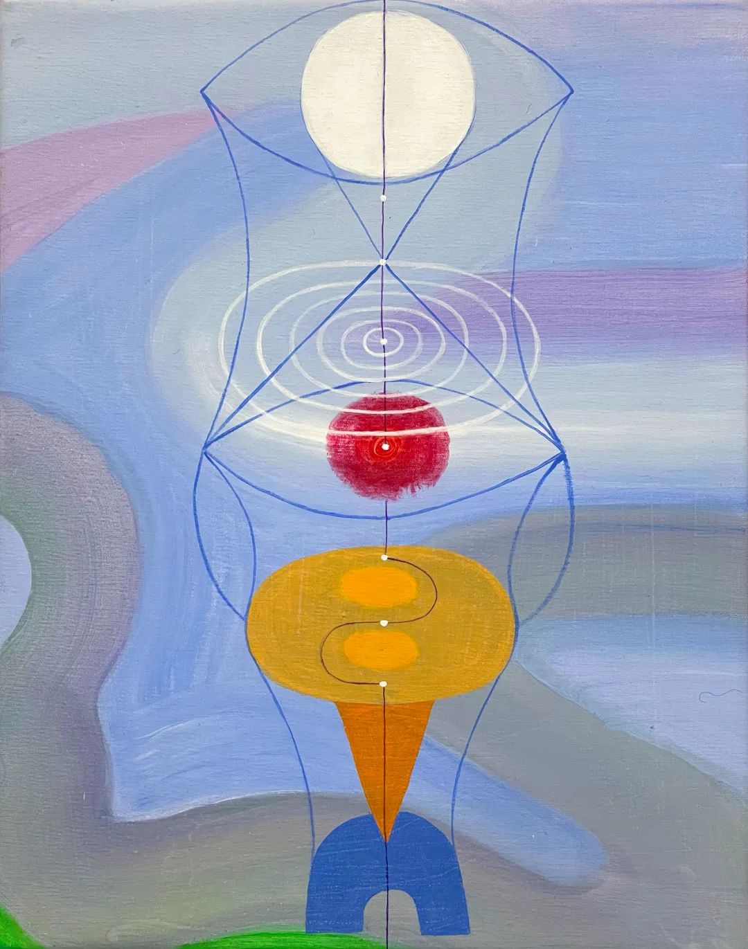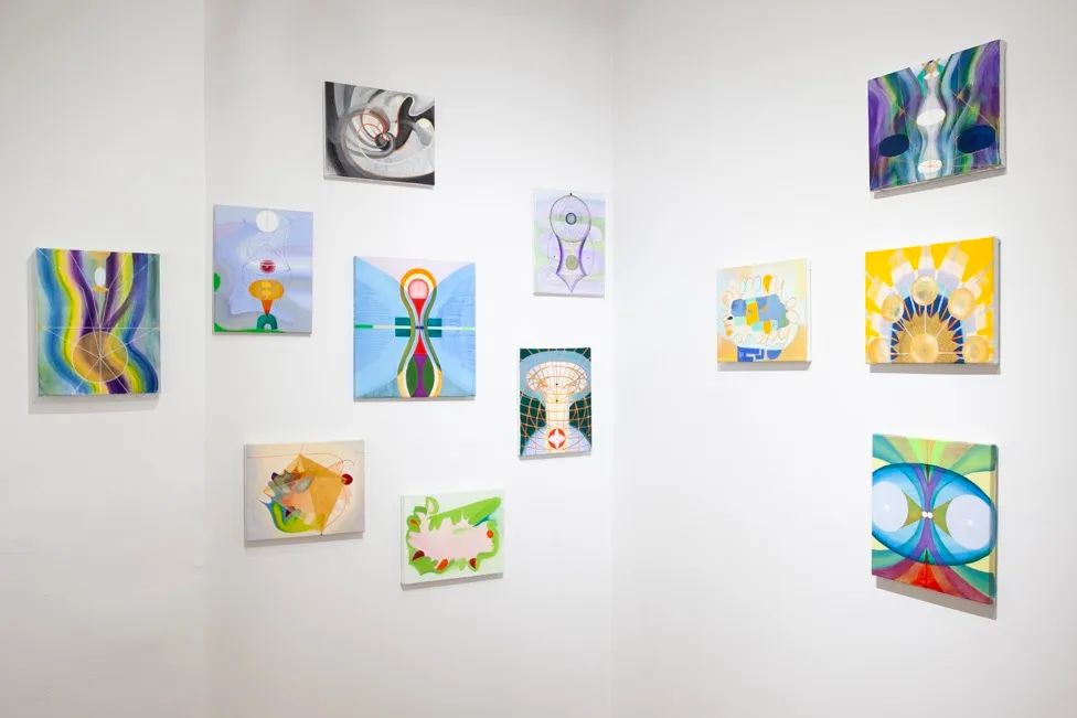 成瑞娴坦言,自己并不是很喜欢绘画人的叙述语言;取而代之的是,在她的很多作品中,与人类身体对齐的脉冲线(chakra line)则经常以坐标轴式的形态出现。