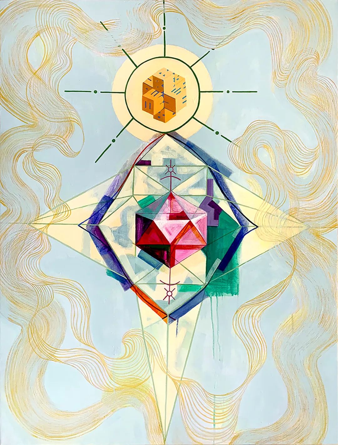 记忆与意识在成瑞娴笔下,似乎有着块状化的迹象。《统一意识3》便以一个具有透视效果的金色几何体,层叠着彩色色块,在突出视觉效果的同时,也让画面形成自由与严谨的对比。