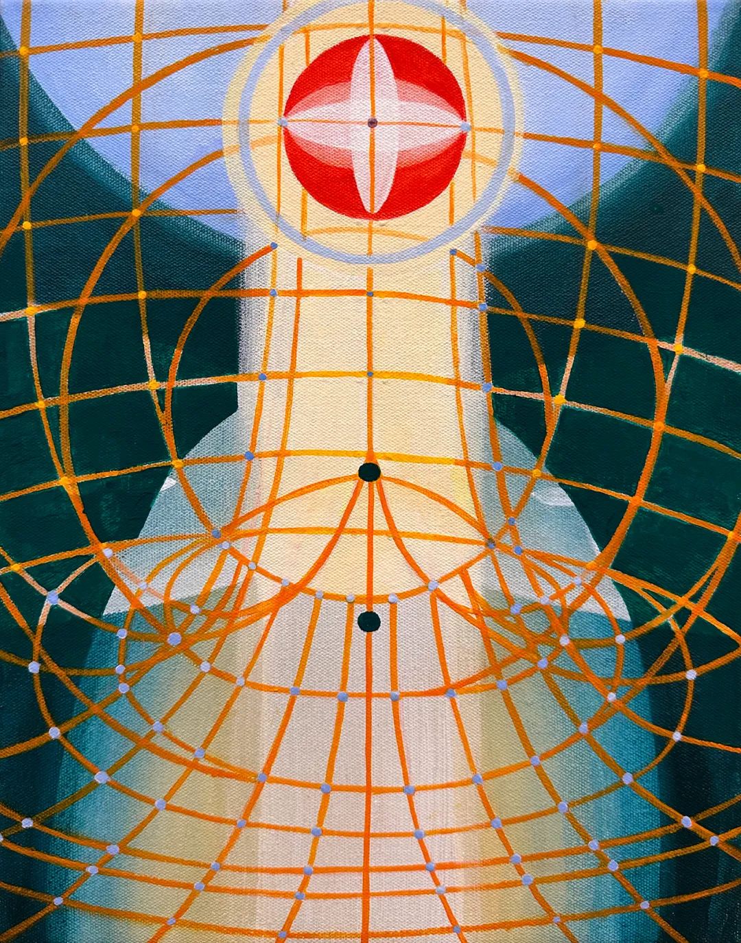 作品《超越雄伟6》,我们看到好似有佛陀的身影伫立在画面中央,线条组成的网状格子环绕在其四周,像是连结人与宇宙、人与自然的能量“传输网”;左右的缤纷色块,犹如佛陀散发的人性光芒,等待观者与其产生心灵的碰撞。
