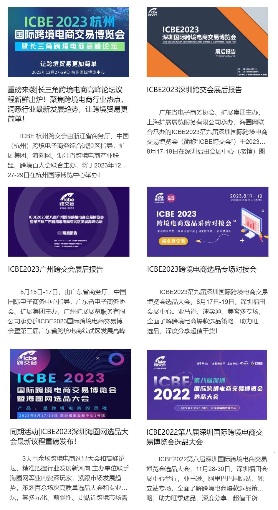 ICBE2023杭州国际跨境电商交易博览会暨长三角跨境电商高峰论坛(简称:ICBE 2023跨交会)将于2023年12月27日-29日在杭州国际博览中心举行,展会现场将特设四大主题展区:跨境电商进出口品牌和生产厂家主题展区、跨境平台展区、跨境服务商综合展区和跨境全产业链特设展区,汇聚跨境电商全产业链,展会现场将邀请亚马逊、新蛋、沃尔玛、eBay、Lazada、速卖通等行业著名平台方齐聚现场,旨在为各跨境平台方、服务商、卖家、传统外贸、制造型企业打造一个具备全球化视野的的交流平台,整合行业最优质的产品资源,内容资源及服务资源,为中国企业开展跨境贸易提供全方位支持,助力中国品牌走向全球!ICBE 2023跨交会,期待您的莅临!厨房用品、卫浴用品、家纺、家具、工艺品、 礼品、家居装修等。户外装备及器材、户外野营用品及附件、户外运动及休闲用品、水上运动、冬季滑雪用品及器材、户外健身运动类、户外各类配件。工艺礼品、 广告类/ 定制 品、电子(消费电子、可穿戴产品)及数码产品、杯壶、厨具、文具及文化用品、包装及纸制品、家庭用品、智能科技类礼品、家纺等。彩妆护肤、美发护发、发制品、美容工具、日用清洁、 用品、 医疗器械等。厨房电器、卫浴家电、生活电器、智能家电、家电供应链等。ODM/OEM贴牌代工:男装、女装、童装、鞋类、配饰,休闲装、牛仔街头装、时尚运动装、羊绒时装、少淑女装、婚纱、礼服、孕妇装、各类织物、面料 、纱线、加工配件、转印材料等。纸包装制品、塑料包装制品、金属包装制品、皮革包装制品、木包装、玻璃包装制品及各类新材料包装制品、创意包装制品、绿色环保可降解包装制品、各类复合材料包装制品、包装材料、包装辅料、相关包装设备。珠宝首饰、宝石及原料、黄金制品、玉石、水晶雕件、流行饰品、矿物标本、机械、设备、工具等相关产品。宠物医疗、宠物食品、宠物粮食、宠物零食、宠物食品添加剂、生产设备及包装技术、宠物服饰、窝垫、美容洗护、项圈、牵引绳、宠舍、猫窝、背包、玩具、食具、推车、训导智能用品及卫生用品。休闲食品、综合进口食品、功能性健康食品、肉类及冰冻食品、绿色农业、饮品及乳制品、ODM/OEM代加工。母婴用品、喂养洗护、婴幼服装、童幼用品、童幼玩具等。部件及组件、电子及系统、用品及改装、修理及维护、管理及数字化运行方案、润滑油及润滑剂等。3C数码(相机、手机、电脑等配件)、智能产品、家用电器、音频与视频产品、电脑终端及周边产品、移动终端设备、可穿戴设备、3C数码配件、健康电子及个人护理、智能出行及汽车电子等。五金工具、手动工具、电动工具、气动工具、汽保工具、机械工具、园艺工具、磨料磨具、机械工具、液压工具、高压清洁设备、工具箱、空压机、刃具、涂料及化工产品、家俱配件、装饰五金等。绿化施工工艺、园林景观材料及配套设施、各类景观照明系统、锄草设备、灌溉设备、园艺照明产品配件、观赏植物、草皮草坪、仿真植物及园林喷灌、节水灌溉产品等。LED光源、太阳能工具、节日灯、办公照明、家居照明、日光灯、支架灯、智能LED灯具、智能家居照明、节能灯饰、户外照明、商业照明、城市亮化、LED照明等。跨境电商B2B、B2C、C2C平台,海内外零售电商、进出口贸易公司、国内主流电商平台、国内进口跨境电商平台等。仓储物流、货运代理、速递、转运、海外仓、关务代理、供应链管理、智能终端、 智能仓储、物流包装、条码标签、搬运等。跨境支付公司、银行、供应链金融、小额贷款、融资结算、信用卡服务、互联网 支付、电子货币、电子支付、移动支付运营商、互联网增值服务等。体验馆、社区电商、社交电商、实体零售、网络零售、商业设计、系统软件、设备、收银系 统、扫描系统、移动业务等。供应链服务商、代运营、培训、知识产权、商标注册等。跨境电商综试区、跨境电商示范城市/区县、跨境电商园区、基地等形象展示等。2023年12月27日 09:00-17:00(16:30停止入场)2023年12月28日 09:00-17:00(16:30停止入场)地铁 7 号线萧山国际机场站到奥体中心站,下车后转地铁 6 号线到博览中心站(D 口)下车前 往杭州国际博览中心 E4 入口。 1、杭州东站前往-地铁 6 号线火车车站(东广场)地铁站到博览中心(D 口)下车前杭州国 际博览中心 6 号门。 2、杭州南站前往-地铁 5 号线火车南站地铁站到长河换乘地铁 6 号线到博览中心(D 口)下 车前往杭州国际博览中心 E4 入口。 从奔竞大道博览中心 3 号门进入地下停车场,行驶至 A 区,由图所示 A 区正下方观光电梯 楼上至展馆 1 层由 E4 进入展馆。