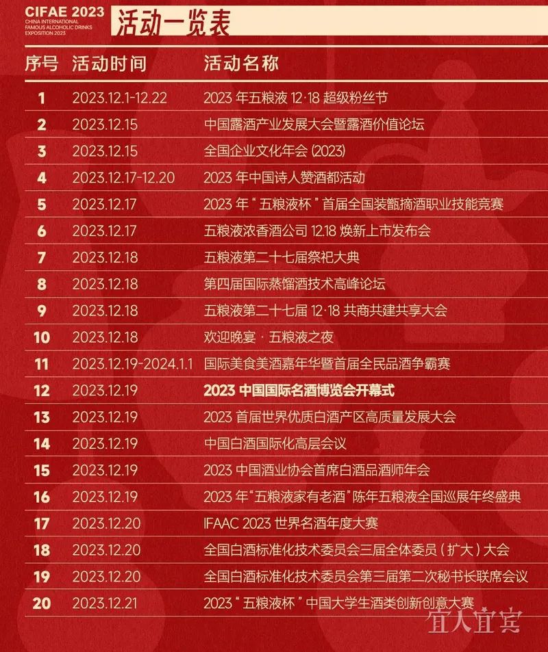 本届名酒博览会涵盖丰富多样的业内业外活动,包括五粮液12·18超级粉丝节、全国企业文化年会、中国诗人赞酒都、国际美食美酒嘉年华暨首届全民品酒争霸赛、2023首届世界优质白酒产区高质量发展大会、2023中国酒业协会首席白酒品酒师年会、国际美食美酒嘉年华暨首届全民品酒争霸赛等一系列主题活动。依托丰富多样的活动内容,加强酒企、产区及酒旅产业之间的交流、合作,推动产业链提质升级,实现产业、产区、本地、酒企四方共赢,共同推动名酒博览会成为全球名酒领域的标杆平台。