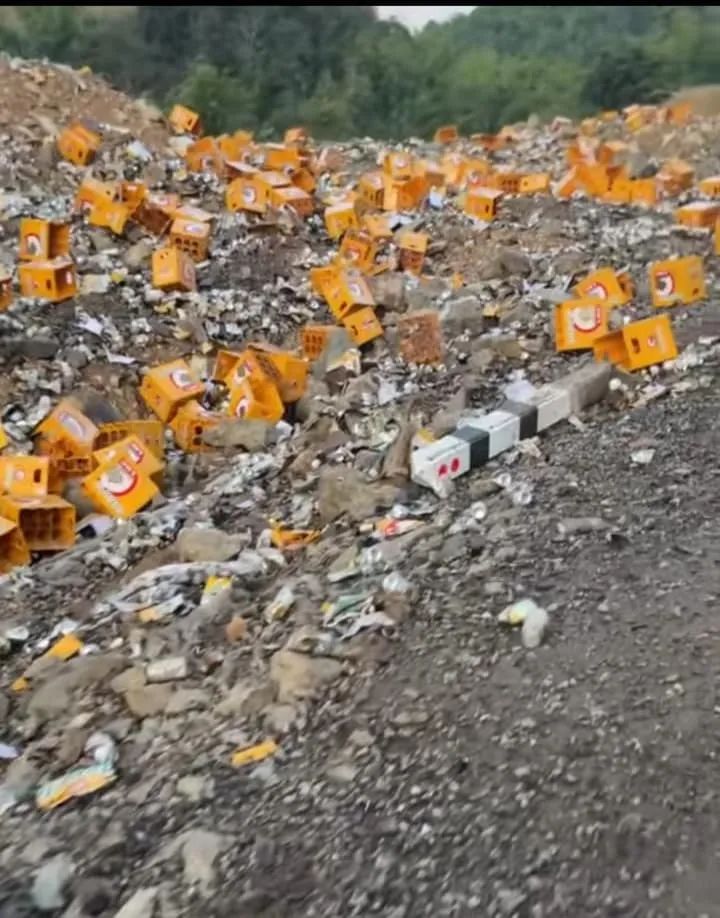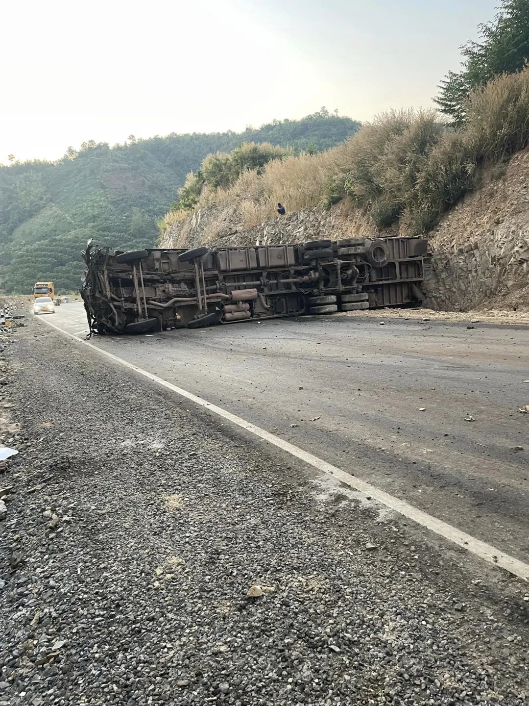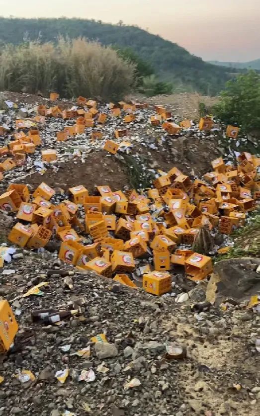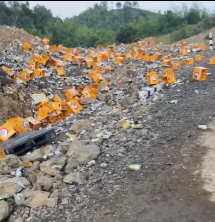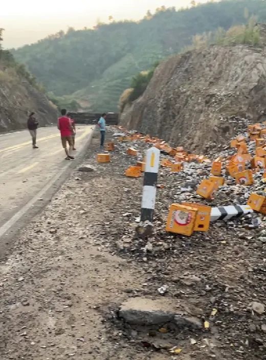 老挝一辆运输啤酒的货车在行驶途中翻车,啤酒“撒”满地