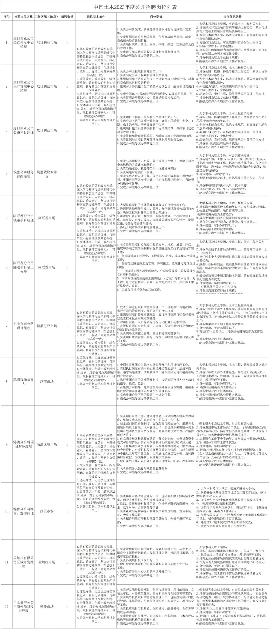 本次招聘的岗位、人数、职责、任职资格等详见《中国土木工程集团有限公司招聘岗位、职责及任职资格》(附件1)。