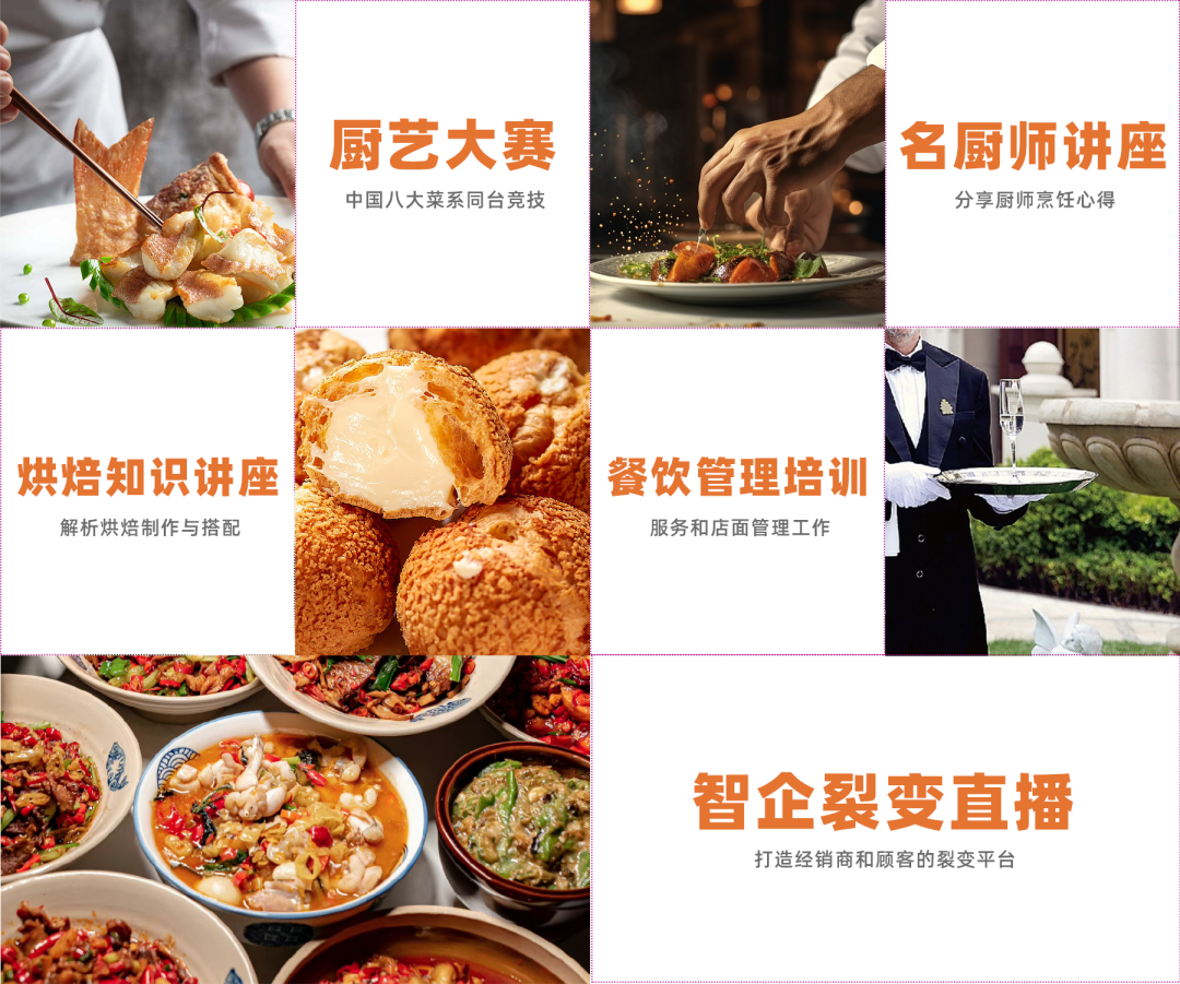 除了组织专业的厂商和采购商到会洽谈外,本届食博会还精心策划了厨艺大赛、烘焙知识讲座、名厨师专业讲座、餐饮服务与管理培训、智企裂变直播等丰富多彩的互动活动,为观展客户提升专业知识和技能,了解2024年餐饮行业及品类发展新趋势!