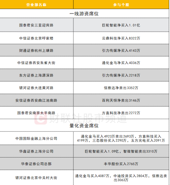 从个股主力资金监控数据来看,主力资金净流入前十的个股所属板块较为杂乱,巨轮智能净流入居首。主力资金流出前十的个股中权重股较多,五粮液净流出居首。四大期指合约多空双方均加仓,其中IH、IF期指空头加仓数量大于多头,IC合约空头加仓数量略大于多头;IM合约多头加仓数量大于空头。龙虎榜机构活跃度仍较为低迷,在线教育概念股方直科技获机构买入超5000万。卖出方面,次新股中机认检遭机构卖出超4000万;创新药概念股百利天恒遭机构卖出1.85亿。一线游资活跃度有所提升,机器人概念股巨轮智能获国泰君安三亚迎宾路买入超亿元;多模态概念股云鼎科技获中信证券北京呼家楼营业部买入超8000万;引力传媒获两家一线游资席位买入。量化资金活跃度有所提升,巨轮智能获一家量化席位买入超亿元;通化金马获两家量化席位买入。风险提示:以上内容仅为个人观点,供交流参考使用,所有内容不做买卖操作依据,据此介入,风险自担,投资有风险,入市需谨慎。