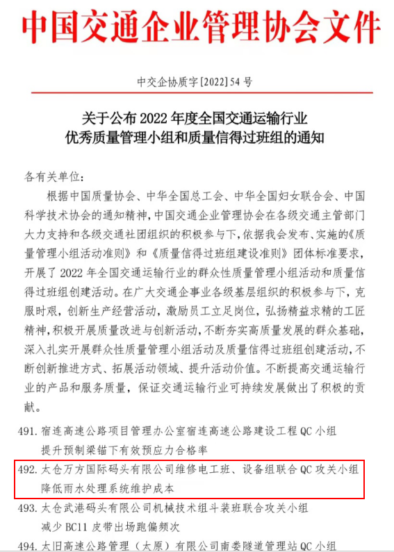 日前,中国交通企业管理协会公布了关于2022年度全国交通运输行业优秀质量管理小组和质量信得过班组的通知,公司维修电工班、设备组联合QC攻关小组及成果:降低雨水处理系统维护成本,荣获交通运输行业2022年度优秀质量管理小组及成果。