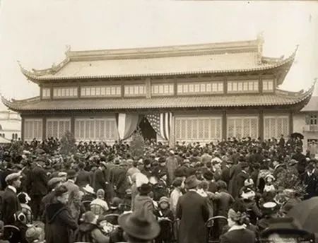 1915年4月22日,中国馆开幕。中国馆建筑仿紫禁城太和殿修建,当天前来参观的就有8万多人。