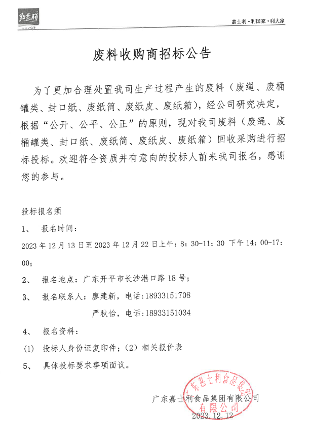 为了更加合理处置我司生产过程产生的废料(废绳、废桶罐类、封口纸、废纸简、废纸皮、废纸箱),经公司研究决定,根据“公开、公平、公正”的原则,现对我司废料(废绳、废桶罐类、封口纸、废纸简、废纸皮、废纸箱)回收采购进行招标投标。欢迎符合资质并有意向的投标人前来我司报名,感谢您的参与。