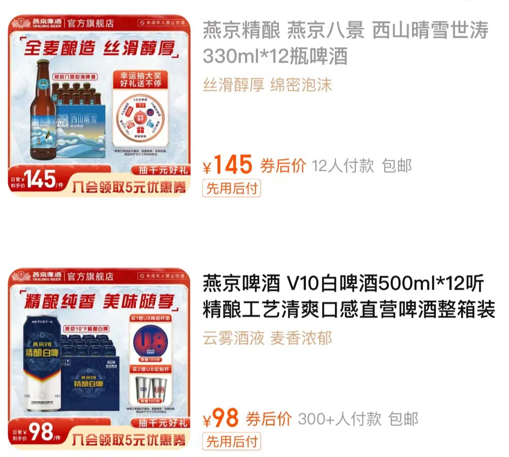 酒讯走访北京多家终端并未发现玻尿酸啤酒产品。在线上,该产品也不见身影。此外,酒讯登录燕京啤酒天猫旗舰店查询获悉,V10白啤酒500ml*12听、燕京八景西山晴雪世涛 330ml*12瓶销量分别为300+笔、12笔。