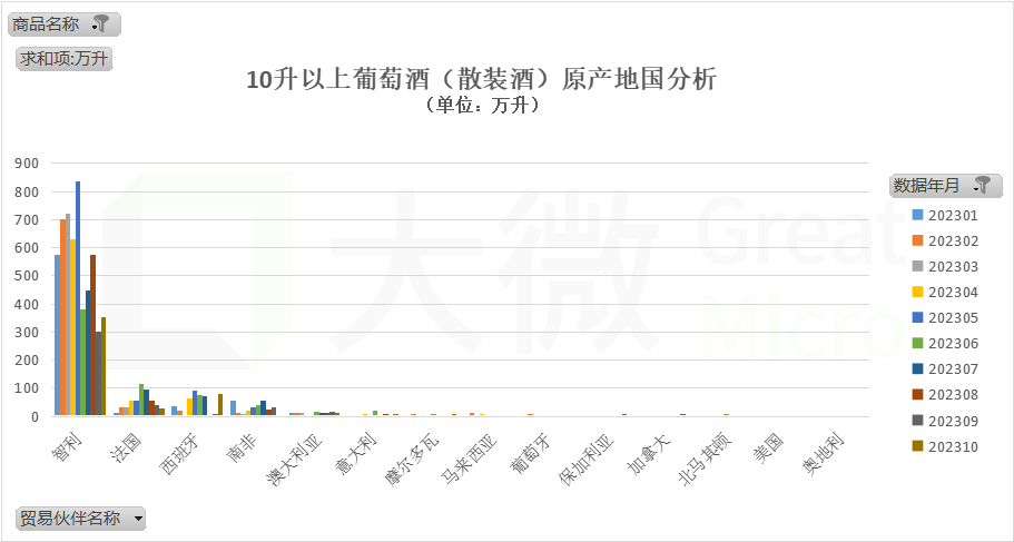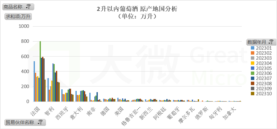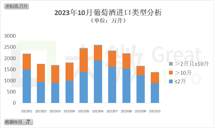 10月份进口量最多的种类为2升及以下的葡萄酒(一般称为瓶装酒),共进口879万升;其次是10升以上的葡萄酒(一般称为散装酒),共进口484万升。2~10升的葡萄酒的进口量则不到8万升。