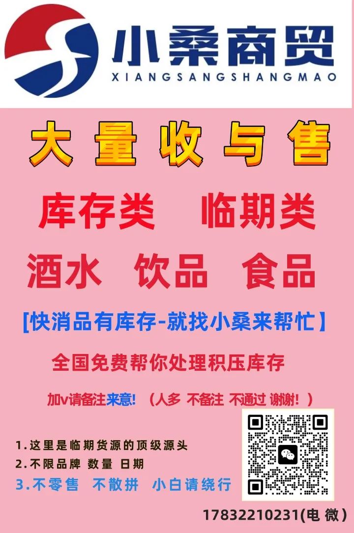 如果你库房里有需要处理的积压库存,卖不出去的产品就联系我们,我们 不限品牌、日期、数量,长期现金收购各种库存,各品牌盒酒,光瓶酒, 啤酒,各种库存临期饮料,临期牛奶,八宝粥等,一次合作终身朋友, 只要是库房里卖不出去的快消品类都可以!