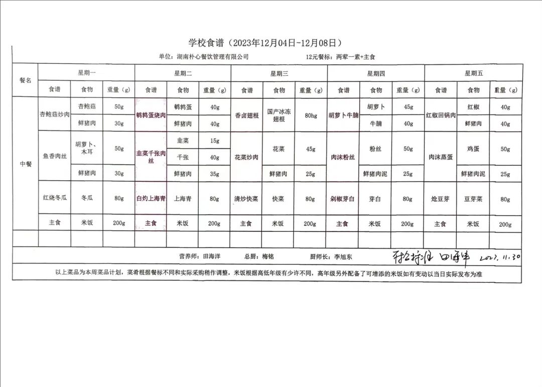 为进一步落实上级文件精神,加强学校配餐管理,确保学生学生营养均衡,提高学生就餐质量,现将育新小学选用的湖南朴心餐饮有限公司一周菜谱带量进行公示,欢迎广大师生、家长提出宝贵意见。
