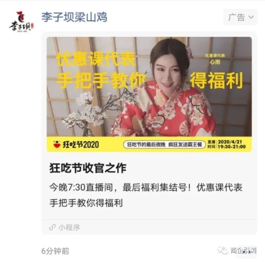 李子坝梁山鸡为直播引流的朋友圈广告外层页面展示