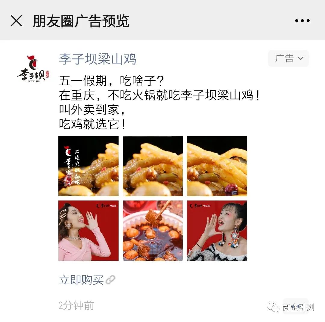 投放初期,李子坝梁山鸡以展示用餐安全的品牌广告为主,先提高客户信任度,紧接着追投外卖点购广告,转化效果明显提高。在广告素材上,团队每次准备20-30组素材,在长期持续的曝光中,保证用户视觉新鲜感。经过测试,六宫格朋友圈广告样式、接地气的视频点击率最高。